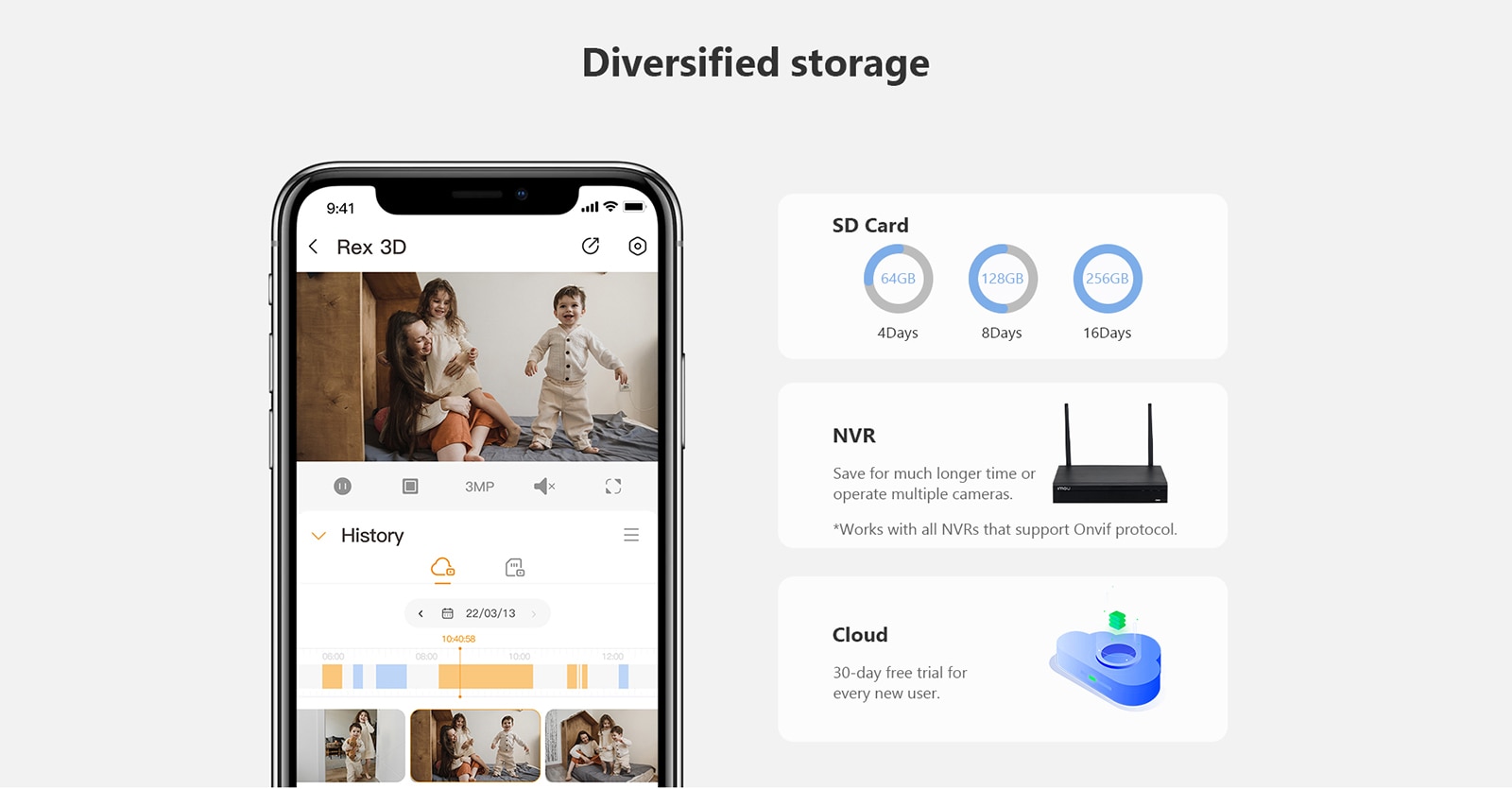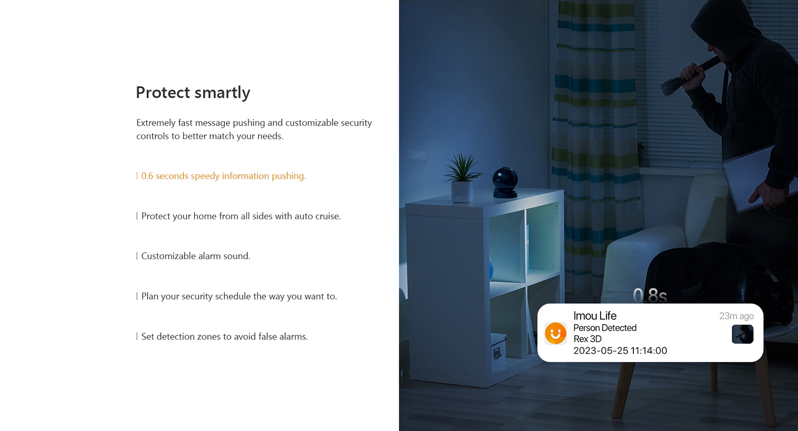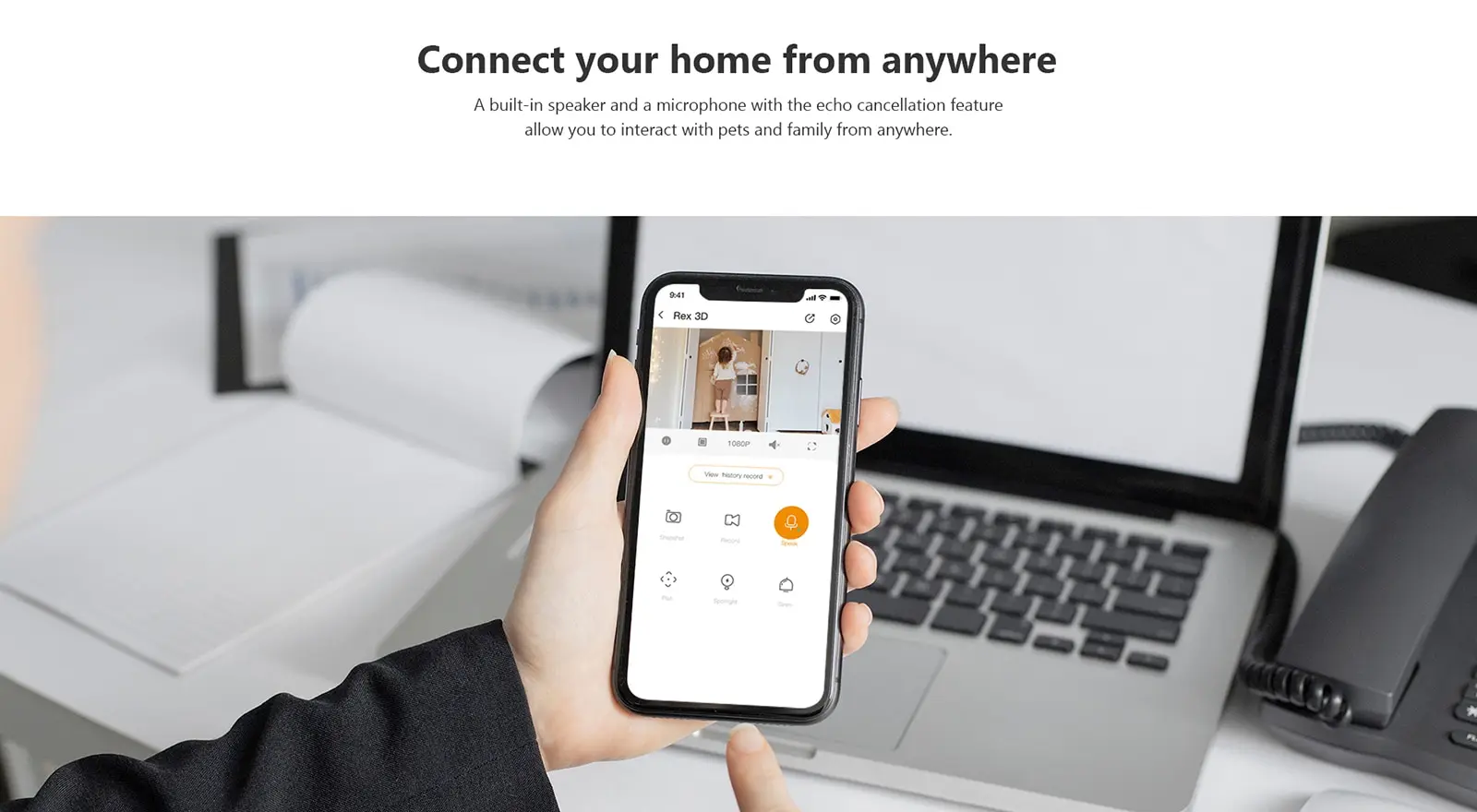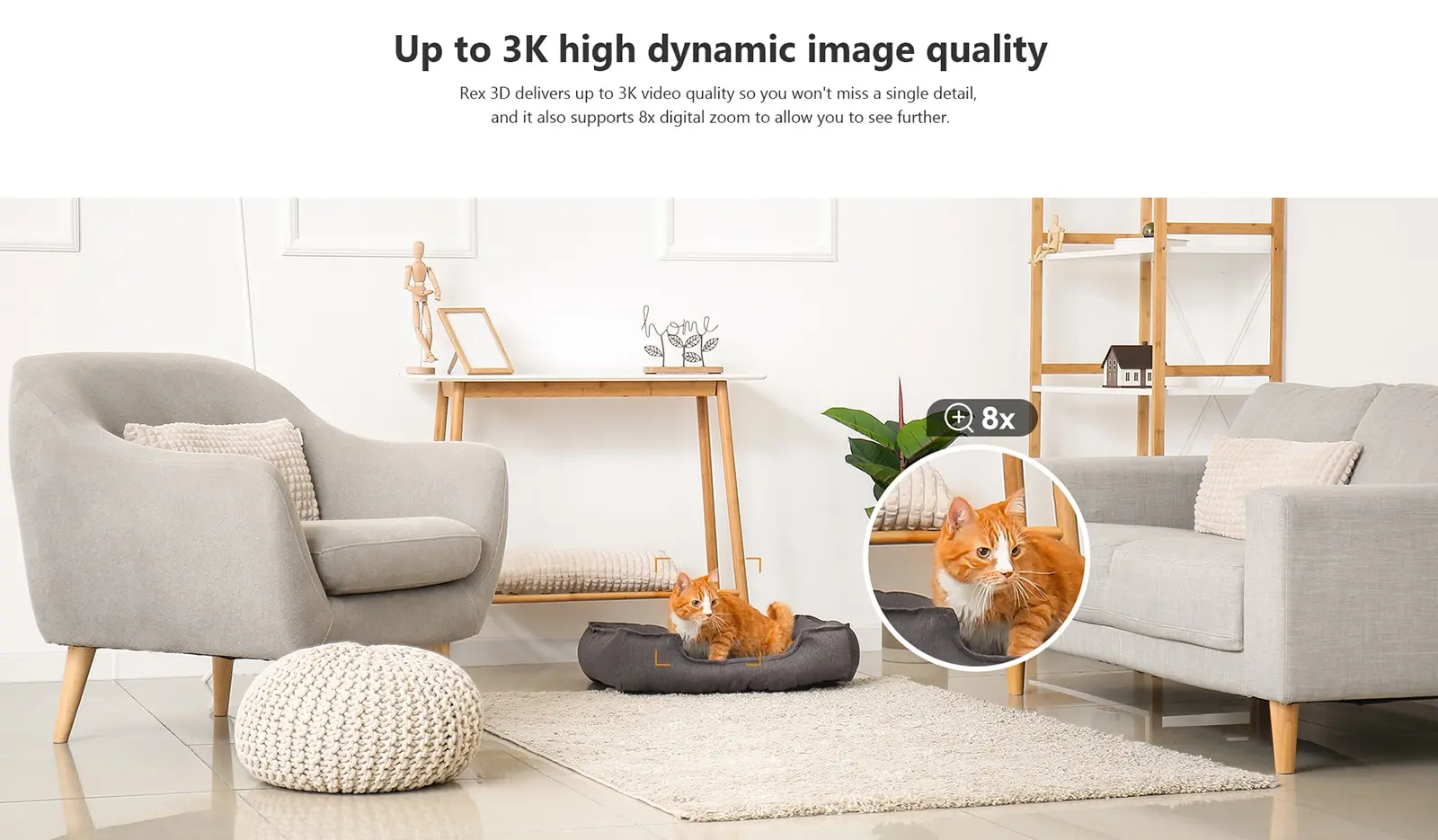 * Благодаря мониторингу в реальном времени 3MP/2K, 5MP/3K и панорамной функции панорамирования и наклона, Rex 3D полностью гарантирует каждый уголок вашего дома