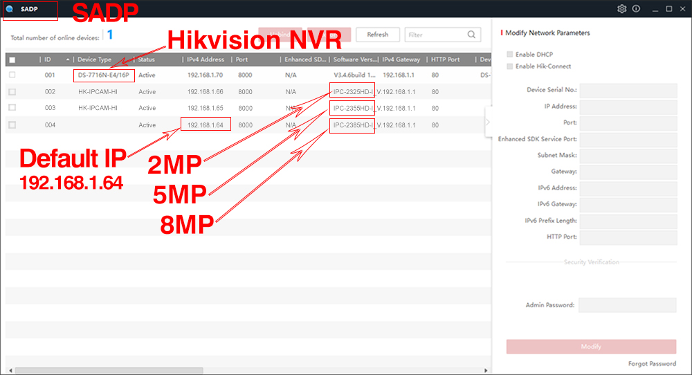 > Инструмент поиска : SADP / AjDevTools (измените IP-адрес и пароль по умолчанию)