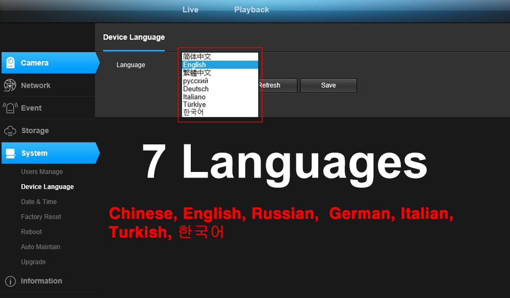 7 языков: китайский, английский, русский, немецкий, итальянский, турецкий,한국어