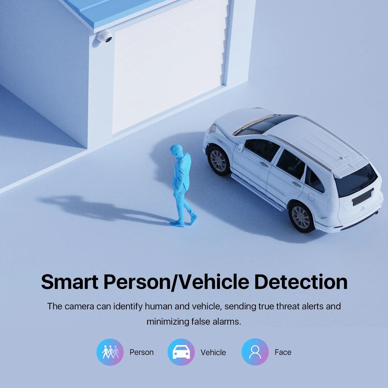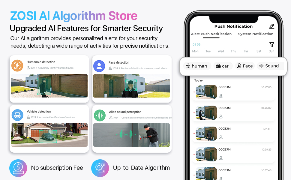 Благодаря передовому алгоритму искусственного интеллекта C225 вы можете настроить эту камеру PoE для обнаружения лица, людей, транспортных средств и звука для точных и интеллектуальных уведомлений, просто выберите нужный режим обнаружения объекта в приложении ZOSI Smart.