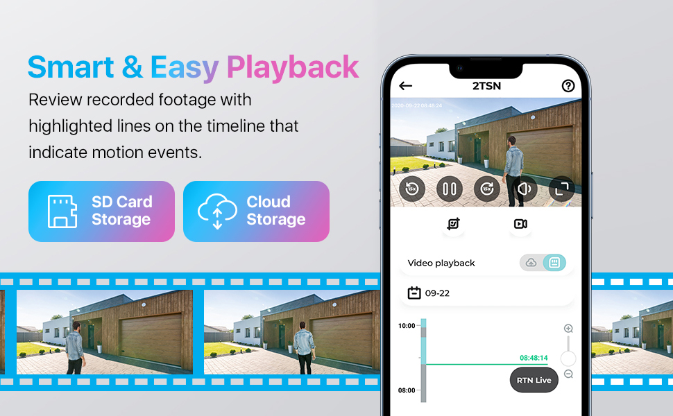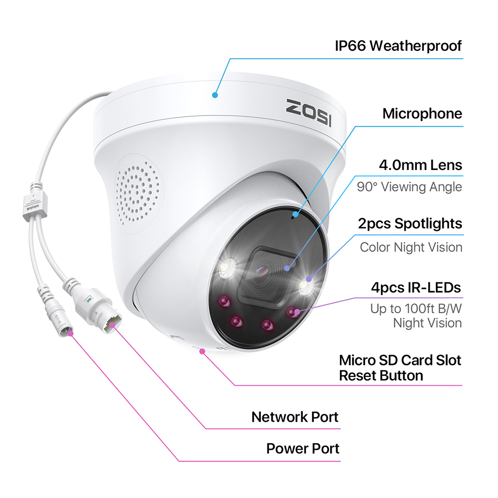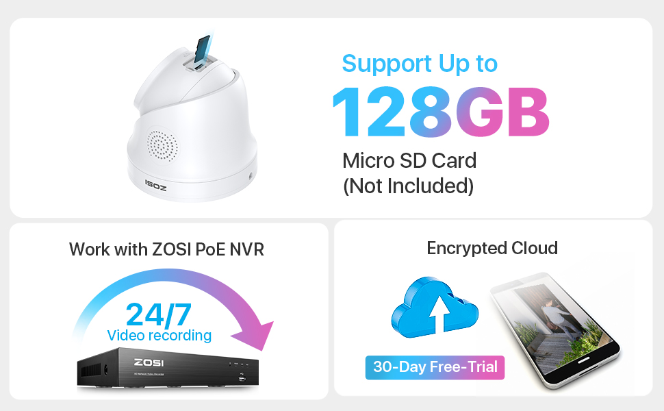 Записывайте кадры локально с помощью карты Micro SD (НЕ входит в комплект, макс. 128 ГБ) или резервное копирование критических моментов в зашифрованное облако для двойной страховки. Или вы можете подключить камеру к ZOSI PoE NVR для увеличения времени записи.