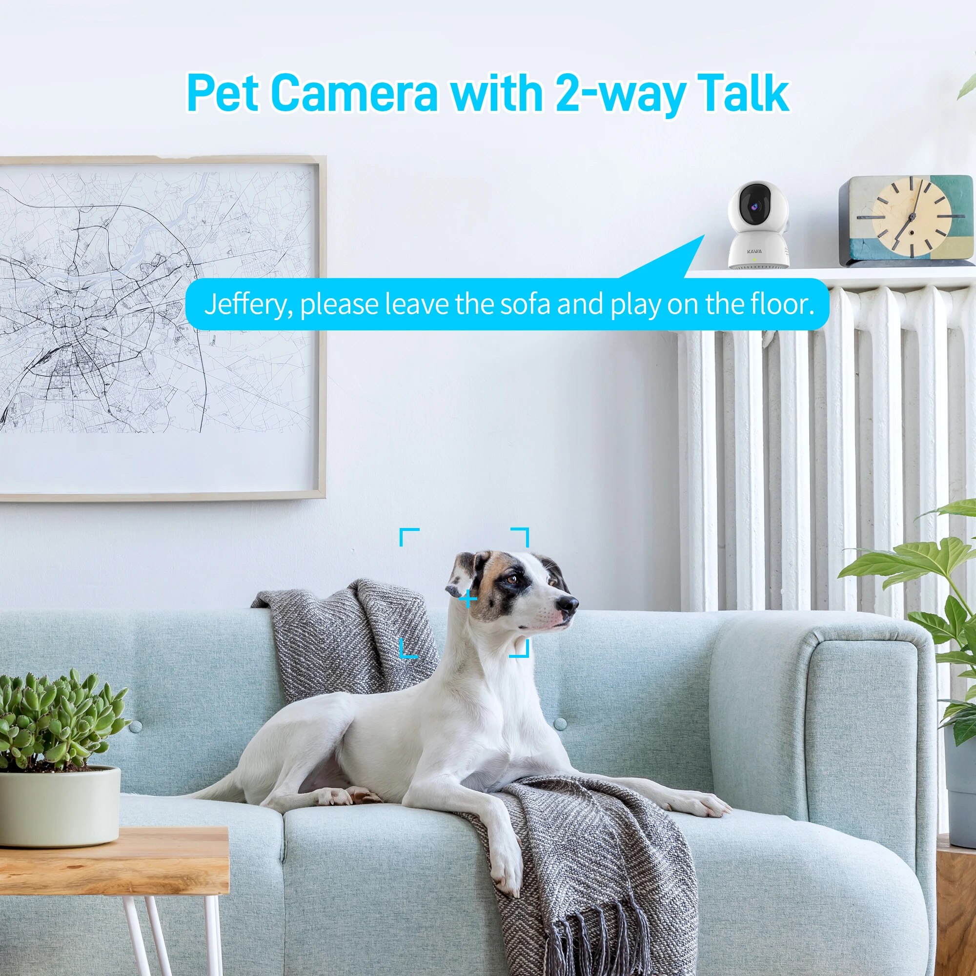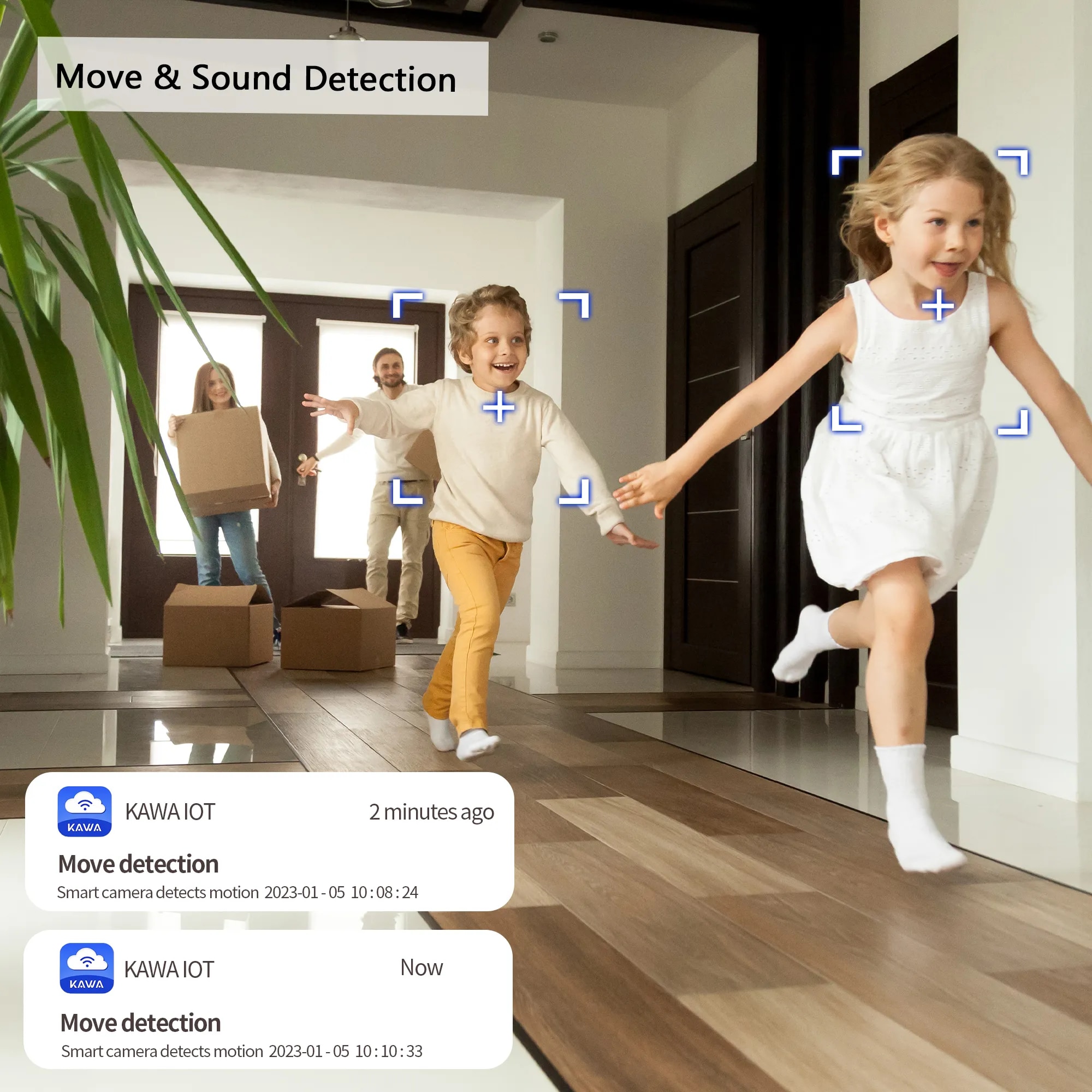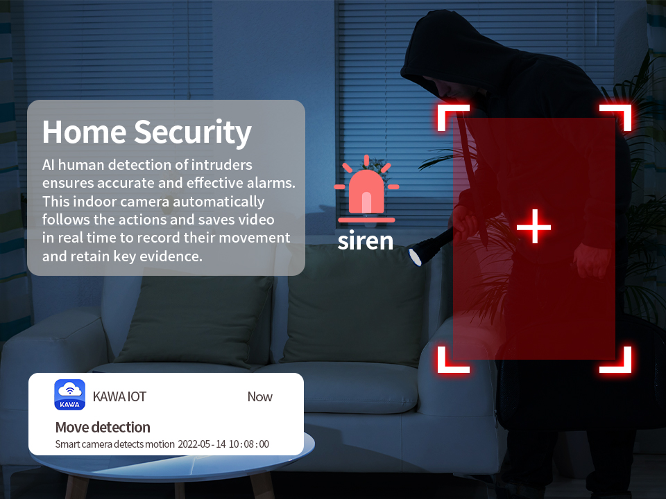 Камера видеонаблюдения KAWA для помещений автоматически отслеживает движения и записывает видео, как только обнаруживает перемещение людей или домашних животных.