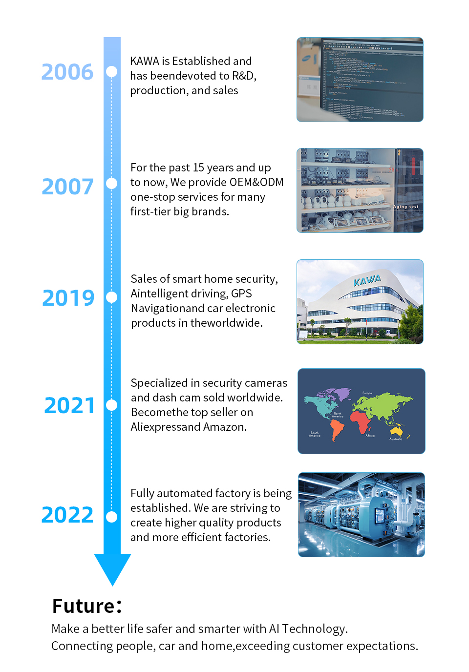 KAWA фокусируется на проектировании, исследованиях и разработках и производстве домашних интеллектуальных продуктов безопасности. У нас есть команда R & D из более чем 200 человек и почти 2000 производственных кадров на базе автоматического производства площадью 30000 квадратных метров.