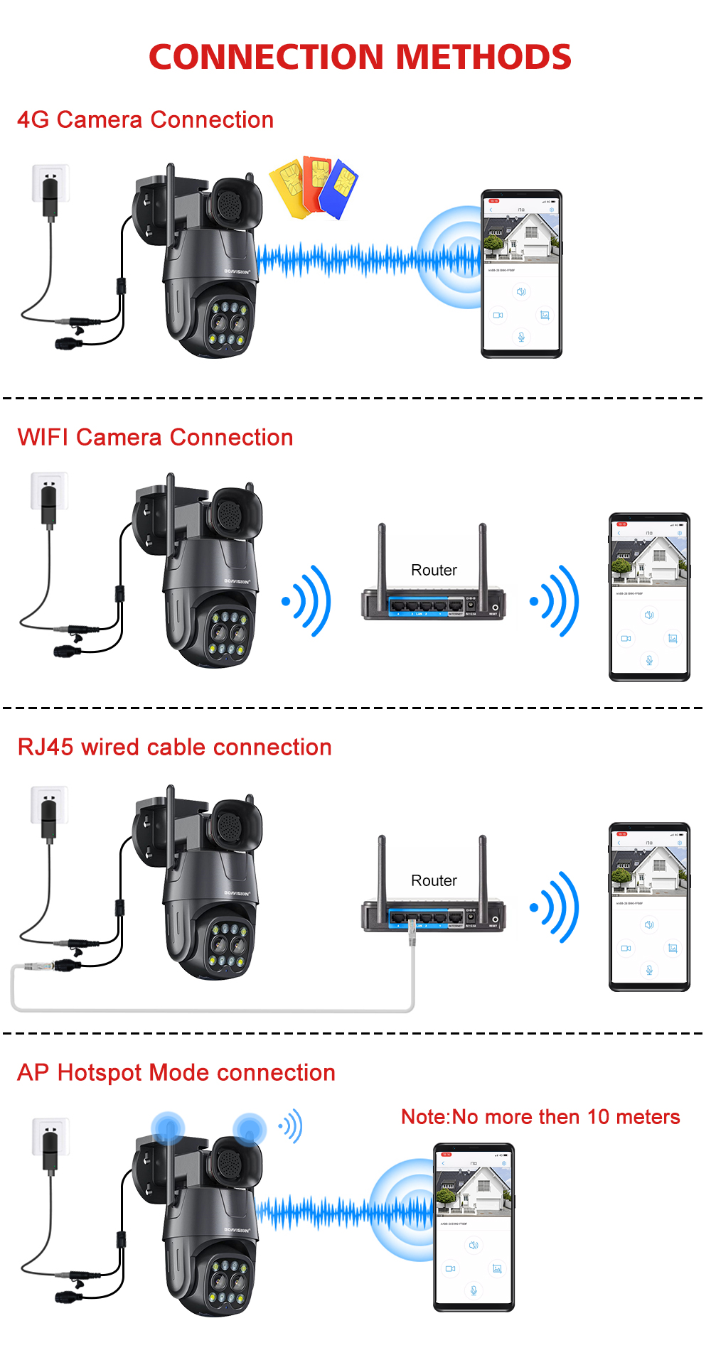 * Поддержка двух датчиков, вы можете переключаться между двумя датчиками через приложение: Camhipro;