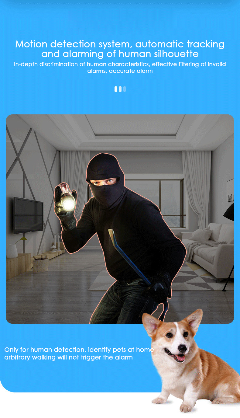 3. Система обнаружения движения, которая автоматически отслеживает и выдает сигнал тревоги, когда появляется человеческая фигура, глубоко определяет особенности человеческой фигуры, эффективно фильтрует недействительные сигналы тревоги и точные сигналы тревоги. Только для гуманоидного обнаружения и распознавания, домашние животные, ходящие по дому, не будут пускать сигнал тревоги.
