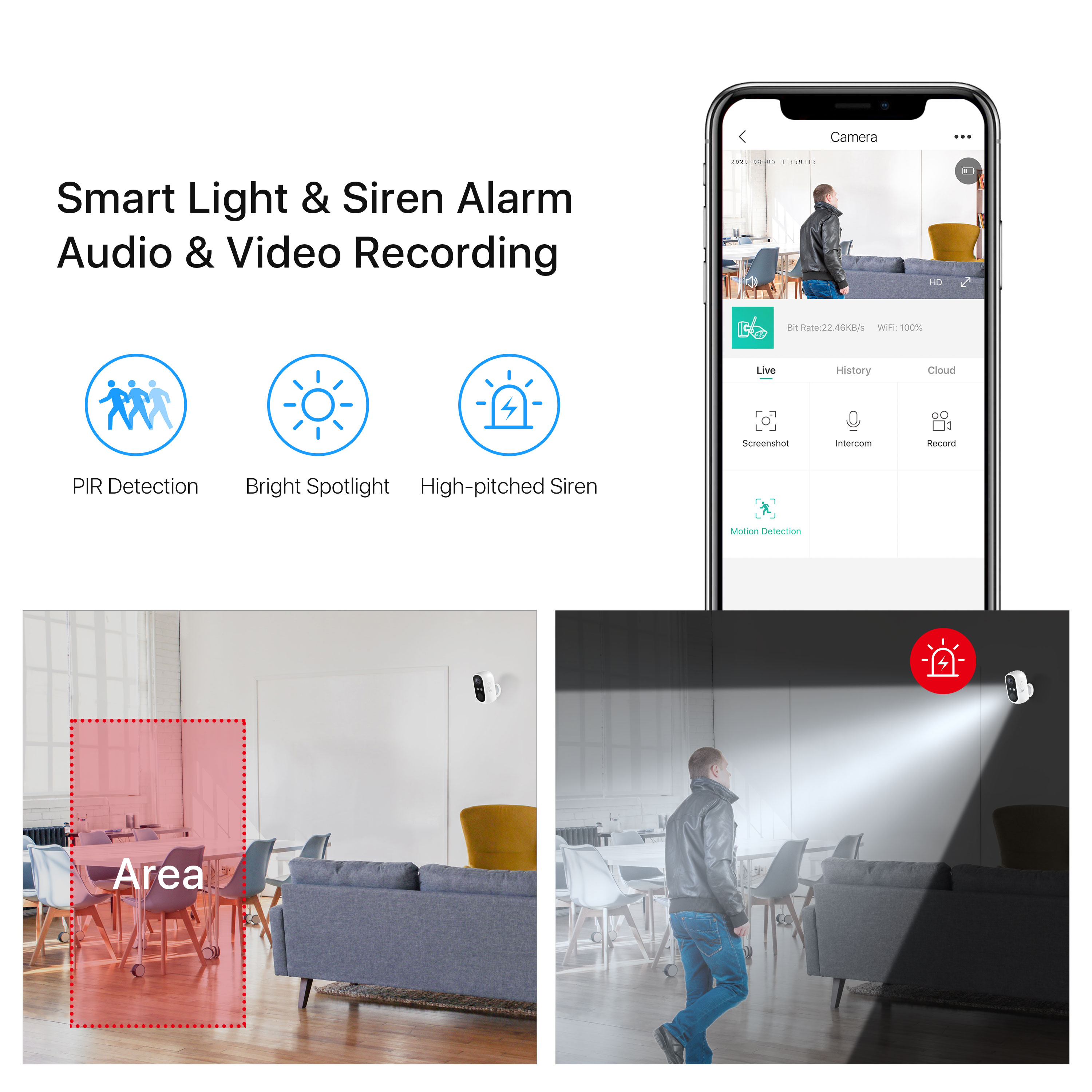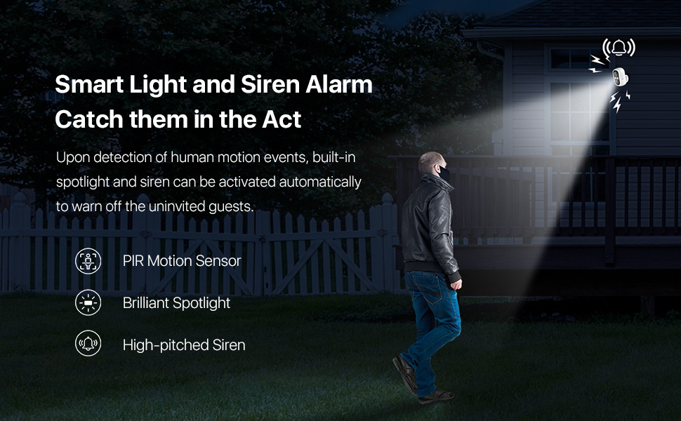 Будучи вашим охранником каждую ночь, эта камера готова реагировать на любую потенциальную опасность с помощью интеллектуальной системы световой и звуковой сигнализации, запускаемой событиями движения человека или управляемой вручную, чтобы избежать проблем.