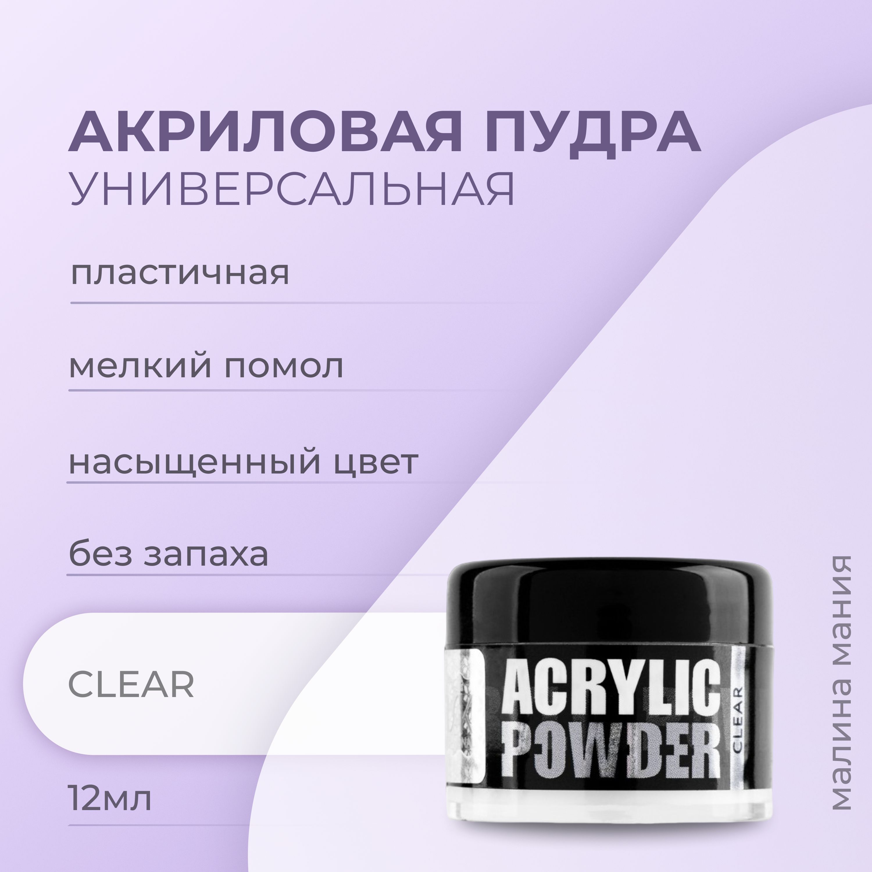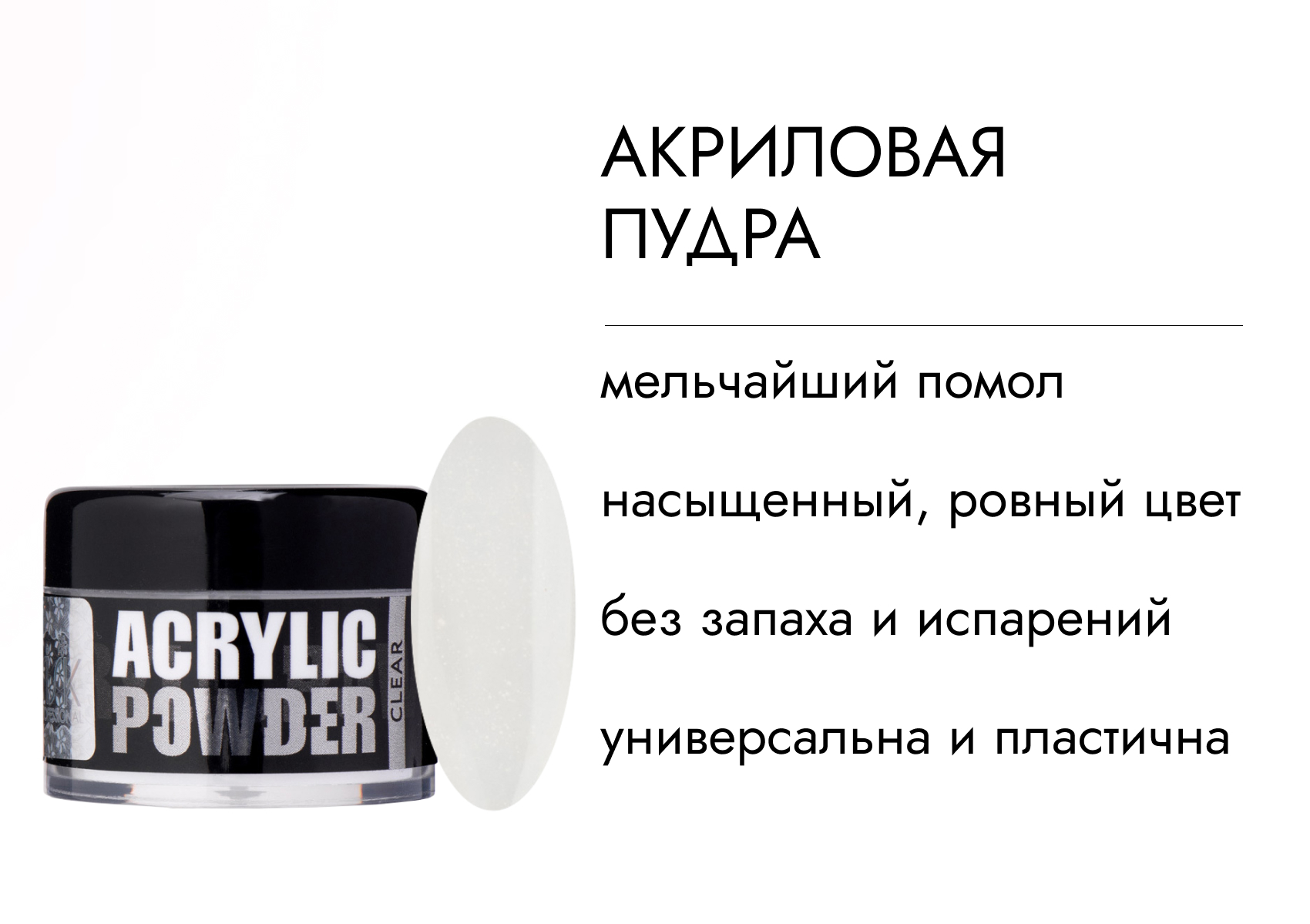 Описание: Clear - Прозрачная акриловая пудра высокой скорости полимеризации, пластична. Универсальна в использовании. Акрил идеально подходит для аквариумного дизайна.  Simple Pack – пластиковая баночка , которая позволит сэкономить Ваши средства.