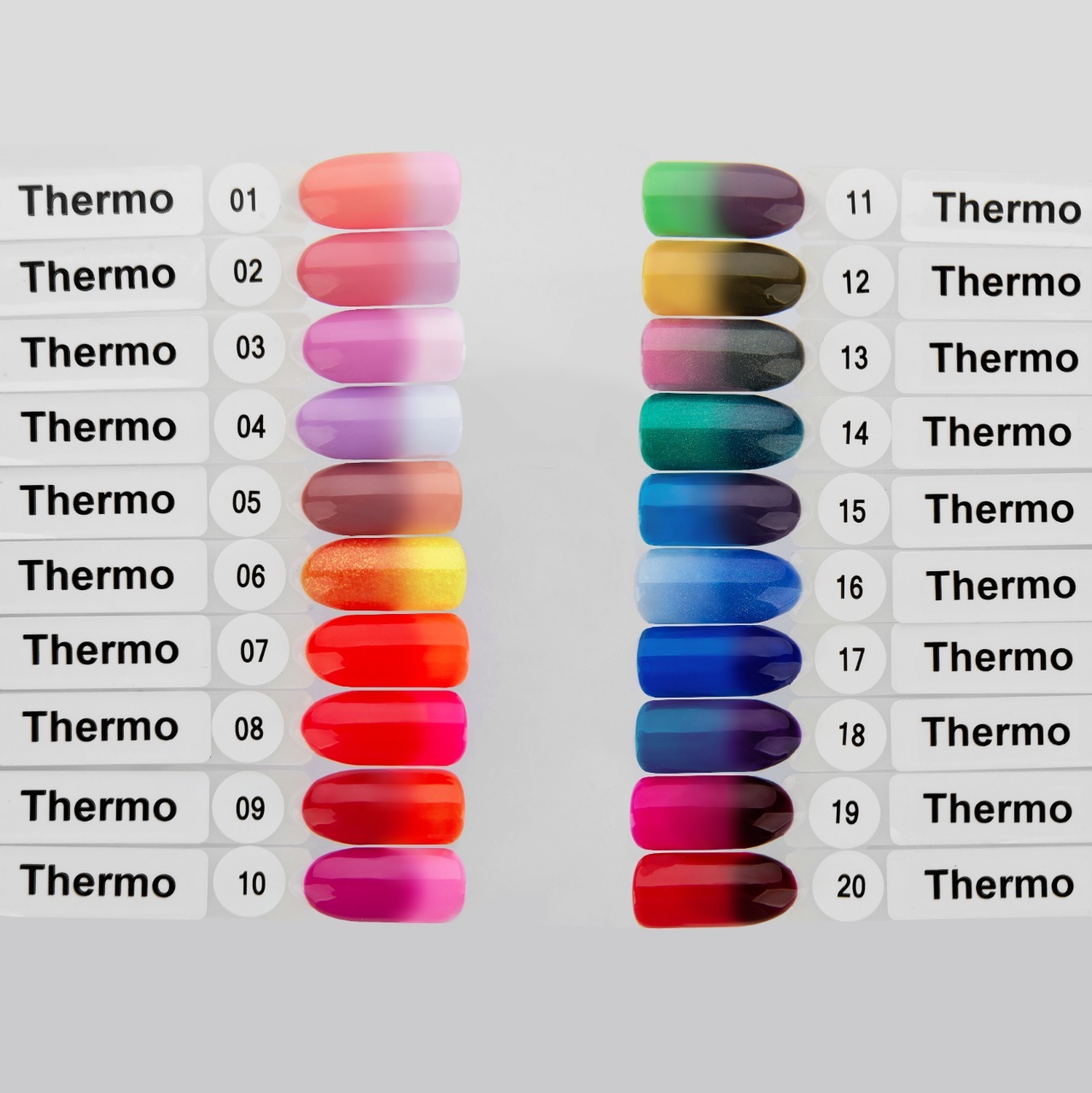 Описание: Новая коллекция Thermo - это гель-лаки, которые плавно меняют свой цвет, реагируя на изменение температуры. Маникюр с гель-лаком Thermo заметно выделяется на фоне однотонных покрытий, можно создать эффект цветного френча, омбре или градиента без дополнительных средств. Богатая цветовая палитра из 20 оттенков порадует самых искушенных клиентов. Гель-лак имеет плотную текстуру, легко самовыравнивается и не оставляет полос. Thermo - отличное решение для нестандартного маникюра!