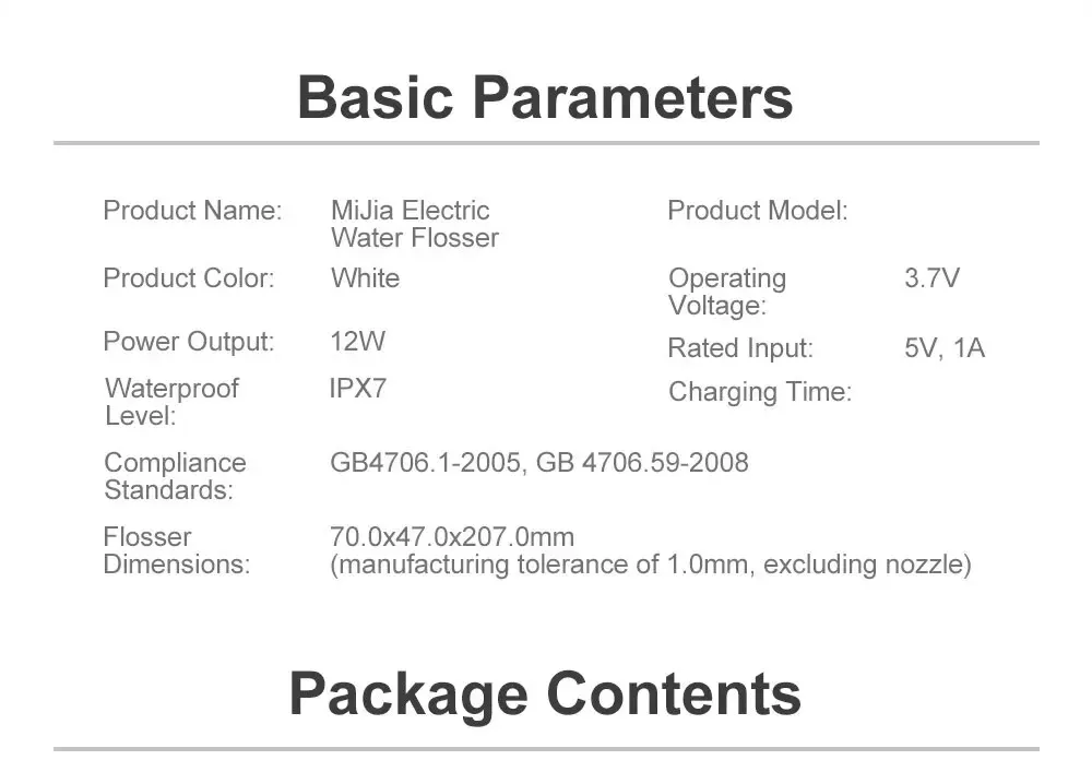 Основной блок X1 Резервуар для воды x1 Стандартное сопло x1 Ортодонтическое сопло x1 Пародонтальное карманное сопло x1 Сопло скребка для языка x1 Зарядный кабель типа C x1 Ящик для хранения сопла x1 Руководство пользователя x1
