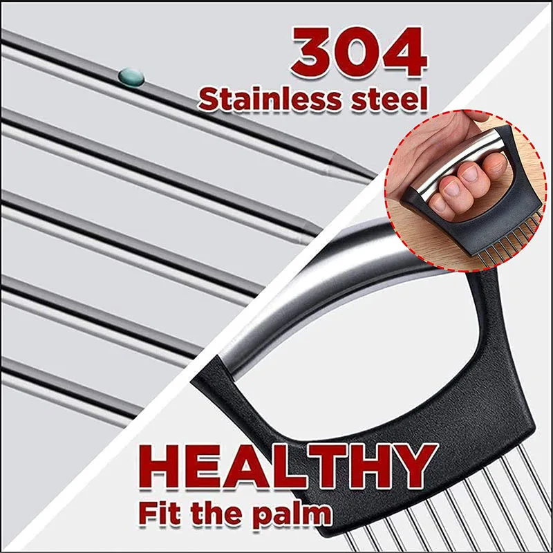• 【Простота использования】 Этот держатель для лука прочный и красивый. Посудомоечная машина безопасна. Очень Толстая пластиковая ручка, нескользящая, делает ваше удержание более удобным. Этот кухонный гаджет «Все в одном» позволяет нарезать однородные ломтики лука, не прикасаясь к нему.