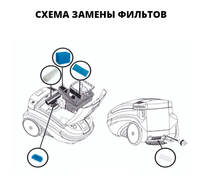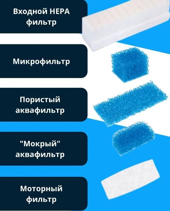 В комплекте: моторный воздушный фильтр для пылесоса, фильтр HEPA, микрофильтр и два фильтра аквасистемы для воды.