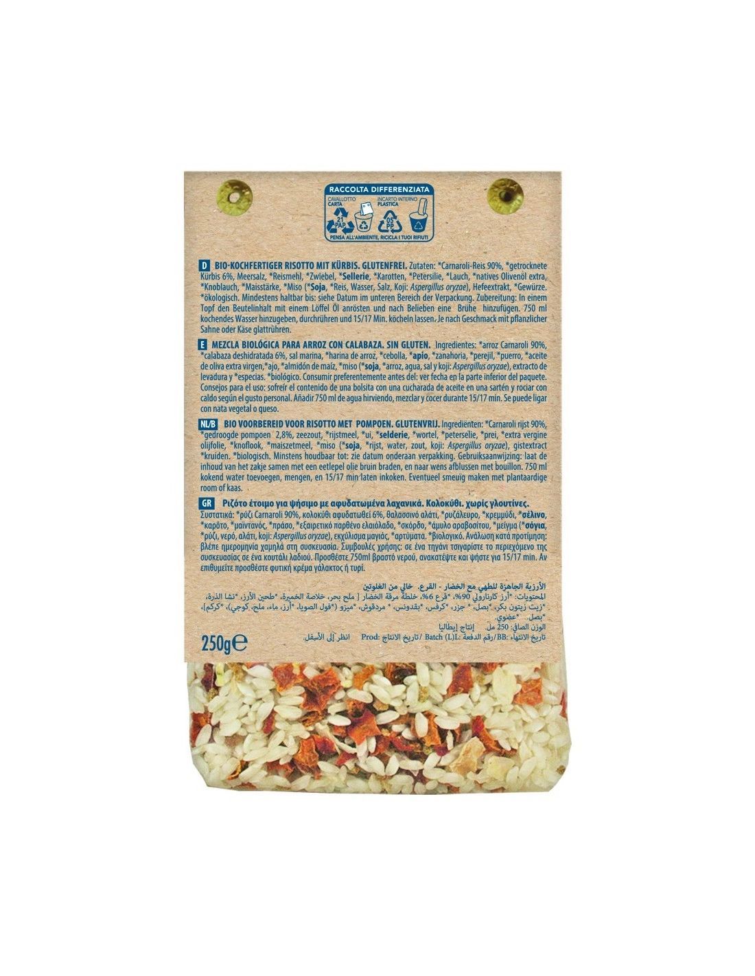 рис карнароли 90%, вяленая тыква 6%, морская соль, рисовая мука, лук, сельдерей, морковь, петрушка, лук-порей, оливковое масло холодного отжима, чеснок, кукурузный крахмал, мисо (соя, рис, вода, соль, коджи Аспергиллус оризе), экстракт дрожжей, специи.