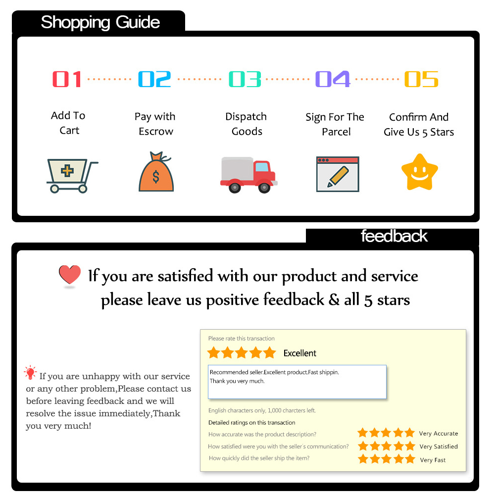 1. Если вы удовлетворены нашей продукцией, Мы будем признательны за ваш пятизвездочный отзыв. Мы дадим вам такой же пятизвездочный отзыв. Но если у вас возникли проблемы с полученным товаром, мы хотели бы, чтобы вы связались с нами, прежде чем оставить отзыв. Мы предоставим вам несколько отличных решений. 2. Мы поддерживаем высокие стандарты отличного качества и стремимся к 100% удовлетворенности клиентов! Если у вас есть вопросы, пожалуйста, сначала свяжитесь с нами! Прежде чем мы попросим вас оставить нейтральный или отрицательный отзыв, свяжитесь с нами. Мы можем предоставить вам отличные решения, чтобы вы остались довольны. Пожалуйста, поверьте нам, чтобы решить эту проблему удовлетворительным образом. 3. Если у вас есть вопросы, свяжитесь с нами. Приятных покупок.
