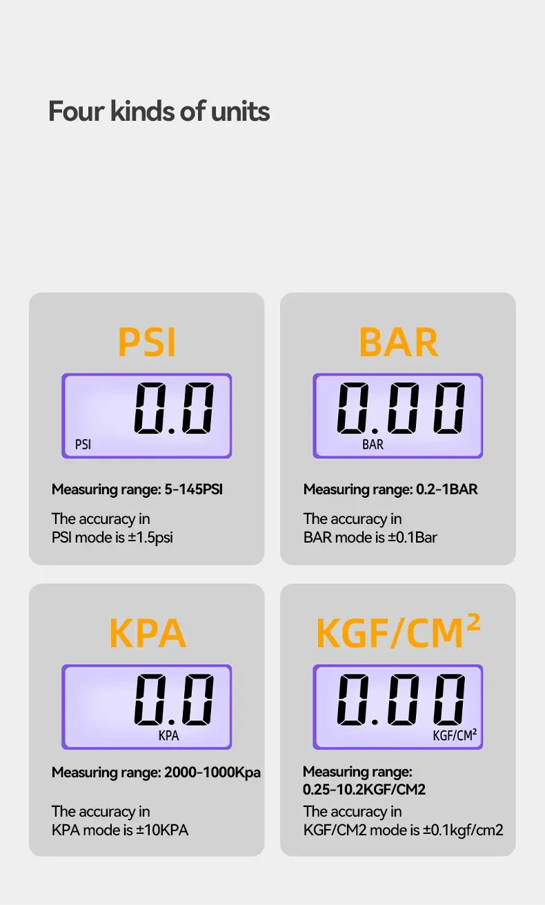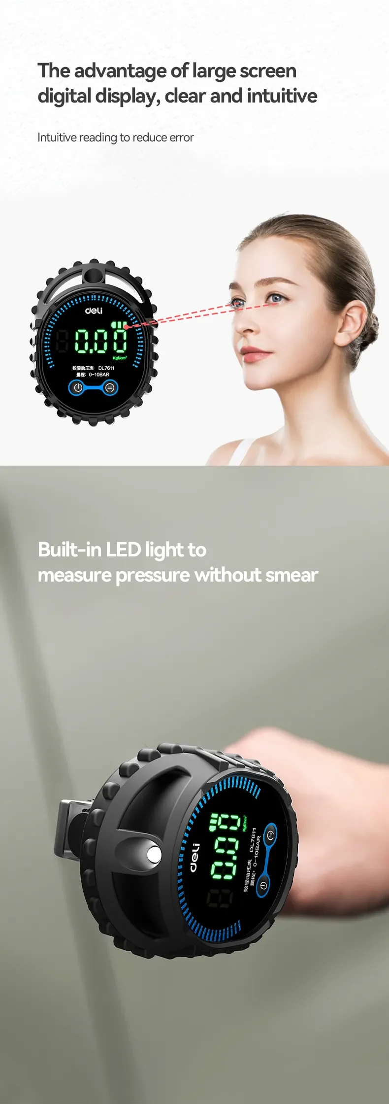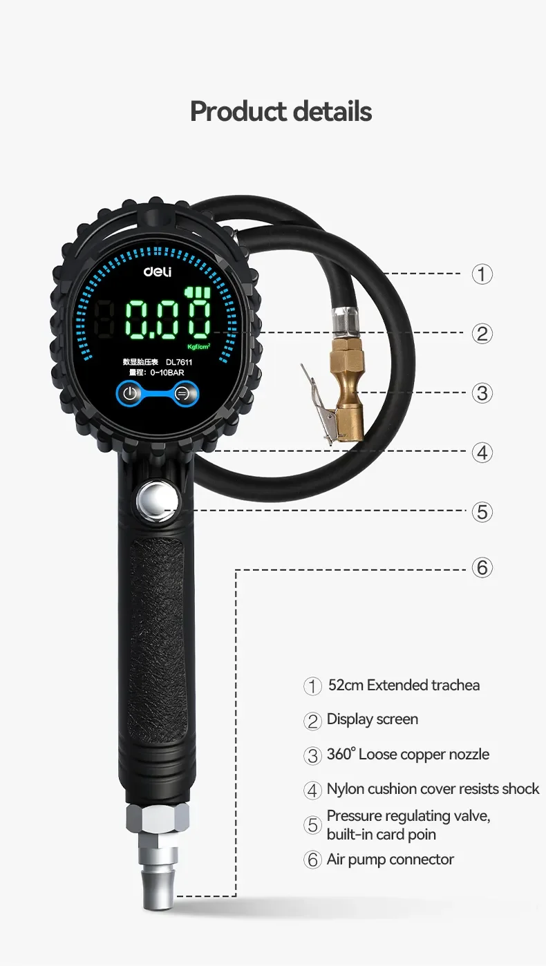 • Простота использования:Благодаря простому дизайну и удобному для чтения дисплею измеритель давления в шинах Deli невероятно удобен в использовании, что делает его отличным выбором для тех, кто ищет надежный манометр в шинах.