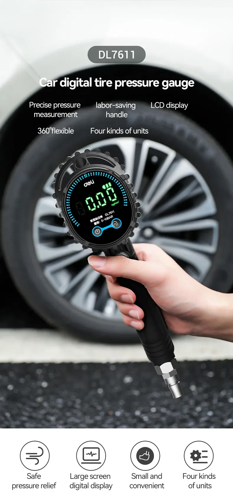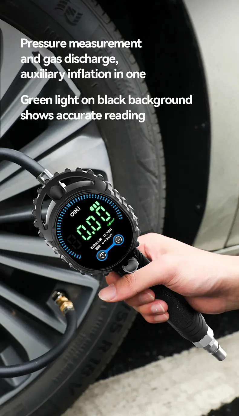 • Точное измерение давления в шинах:Измеритель давления в шинах Deli обеспечивает точное измерение давления в шинах, гарантируя, что шины вашего автомобиля правильно накачаны для оптимальной работы.