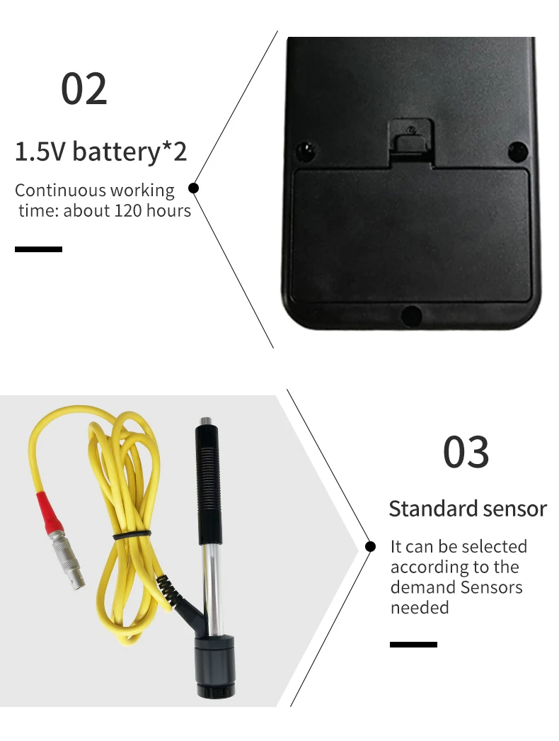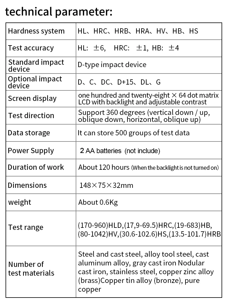 1. Этот прибор оснащен датчиком D-типа, который должен измерять твердость металла более 5 мм. Зонд D-типа-это обычный зонд, который подходит для измерения большинства деталей. Заготовки из специальных материалов должны быть оснащены другими типами зондов.