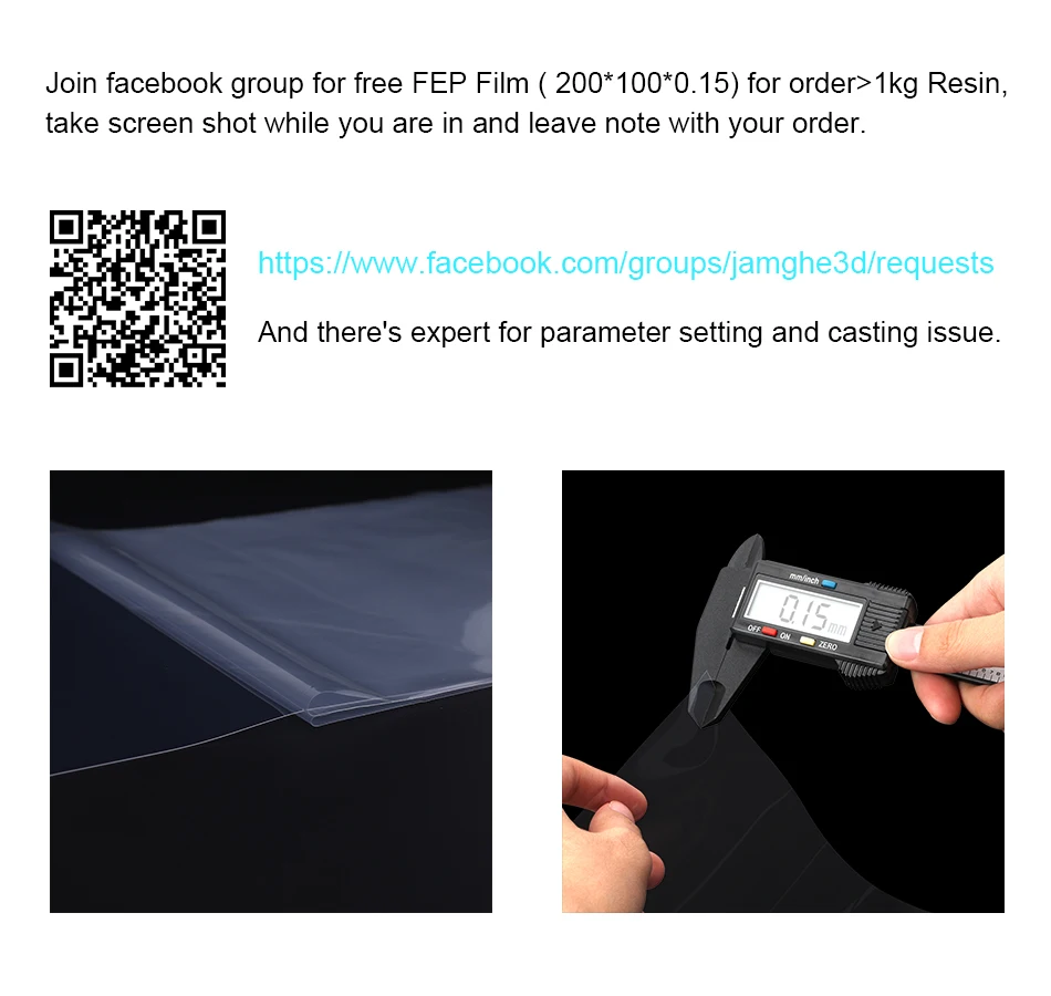 Присоединяйтесь к группе facebook бесплатно FEP Film ( 200*100*0,15) для заказа> 1 кг смолы, сделайте снимок экрана во время вашего нахождения и оставьте свой заказ.