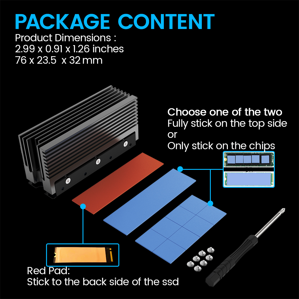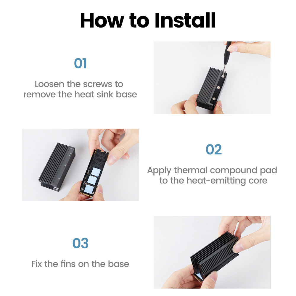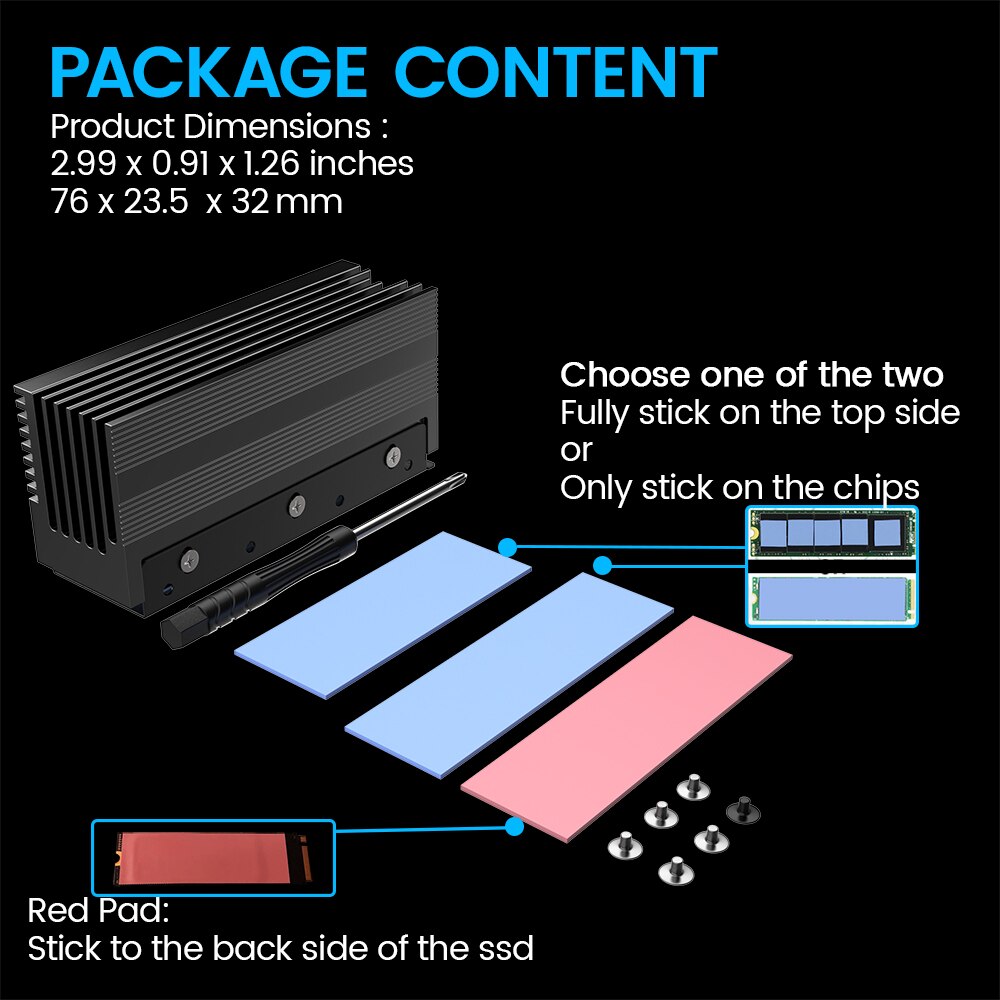 3. Радиатор имеет фиксируемую винтами раму и две прокладки из термокомпаунда с высокой проводимостью, которые могут заполнить контактный зазор твердотельного накопителя. Когда винты затянуты, Твердотельный накопитель будет быстрее рассеивать тепло, а мягкие прокладки из термосостава могут заставить твердое основание радиатора мягко касаться твердотельного накопителя, не повреждая его.