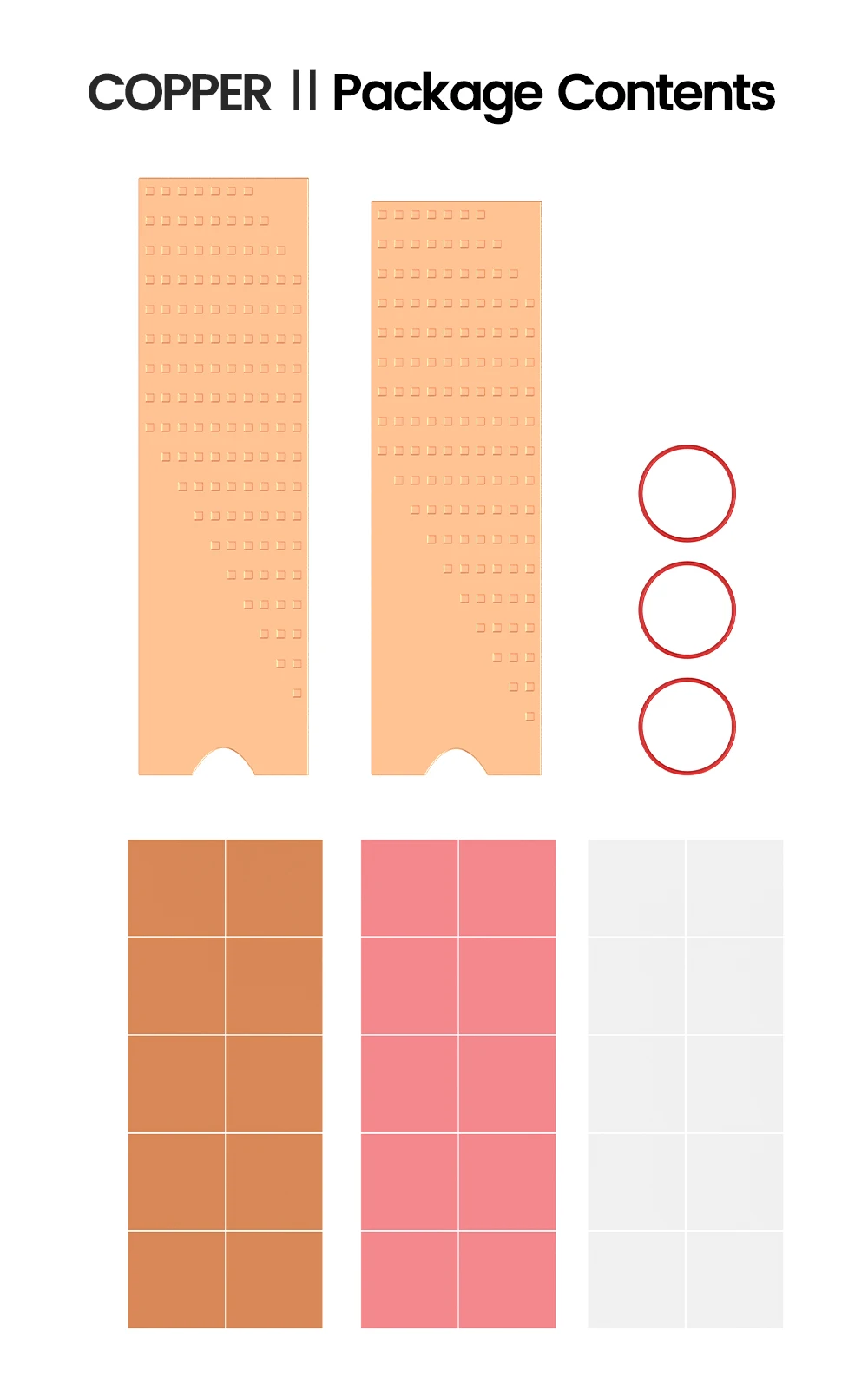 【Упаковочный лист】 Медь JEYI Ⅱ: 1 шт. 74*22*0,8 мм и 1 шт. 77*22*1 мм медные радиаторы. JEYI Copper Ⅲ: 1 шт. 77*22*2 мм, 1 шт. 77*22*1 мм и 1 шт. 74*22*0,8 мм медные радиаторы
