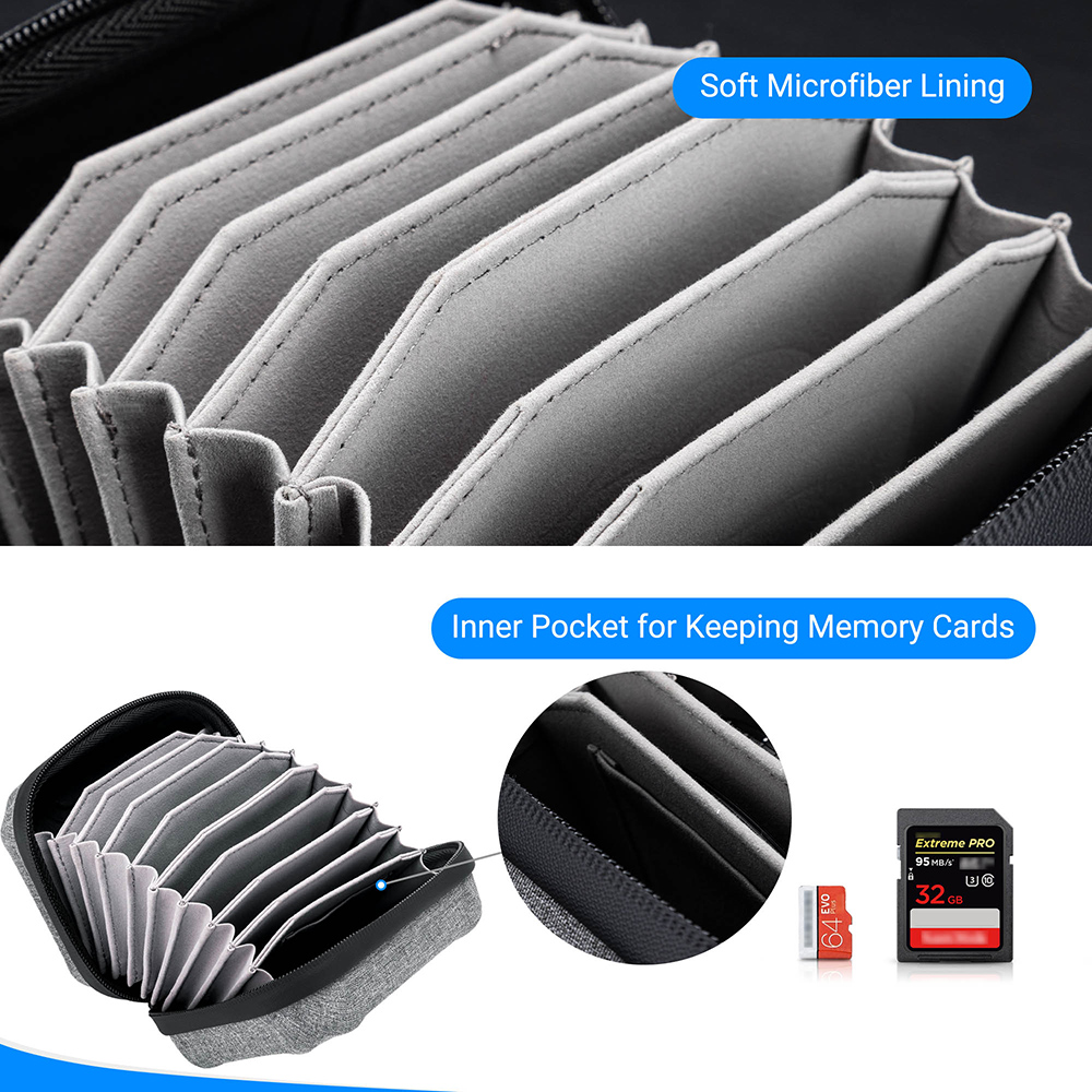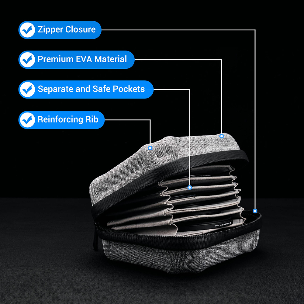 Чехол для фильтра специально разработан для хранения до десяти круглых фильтров диаметром 95 мм *, защищающих ваши фильтры от пыли, ударов и брызг воды. Внешняя часть фильтровального чехла с усиливающим ребром изготовлена из высококачественного материала EVA, прочного и долговечного. Кроме того, он имеет амортизацию, чтобы уменьшить риск повреждения в результате удара. Широкая застежка-молния легко открывается и закрывается, позволяя фильтрам видеть с первого взгляда. Карманы-вкладыши из микрофибры с десятью независимыми прорезями надежно удерживают каждый фильтр и предотвращают их соприкосновение друг с другом, сохраняя их хорошо организованными и у вас под рукой.