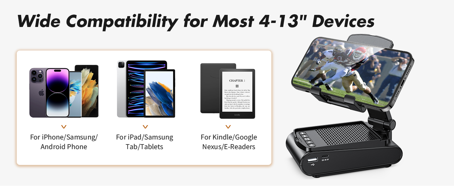 Эта подставка для мобильного телефона с портативным динамиком Bluetooth совместима с большинством смартфонов, планшетов или электронных книг 4-13 дюймов, например, iPhone 14 Pro Max/ 14 Pro/ 14 Plus/ iPhone 13 Pro Max/ 13 Pro/ 13/ iPhone 12 Pro Max/ 12 Pro/ 11/ Xs Max/ Xs/ XR/ X/ 8 7 6 6S Plus 5 5S SE, Samsung Galaxy S23/S22 /S21 /S20/S10, Note 20/10/9, iPad Mini/Air/Pro, Google Nexus, Kindle и многое другое. Обратите внимание, что устройства размером более 13 дюймов с защитными чехлами могут не использовать подставку.