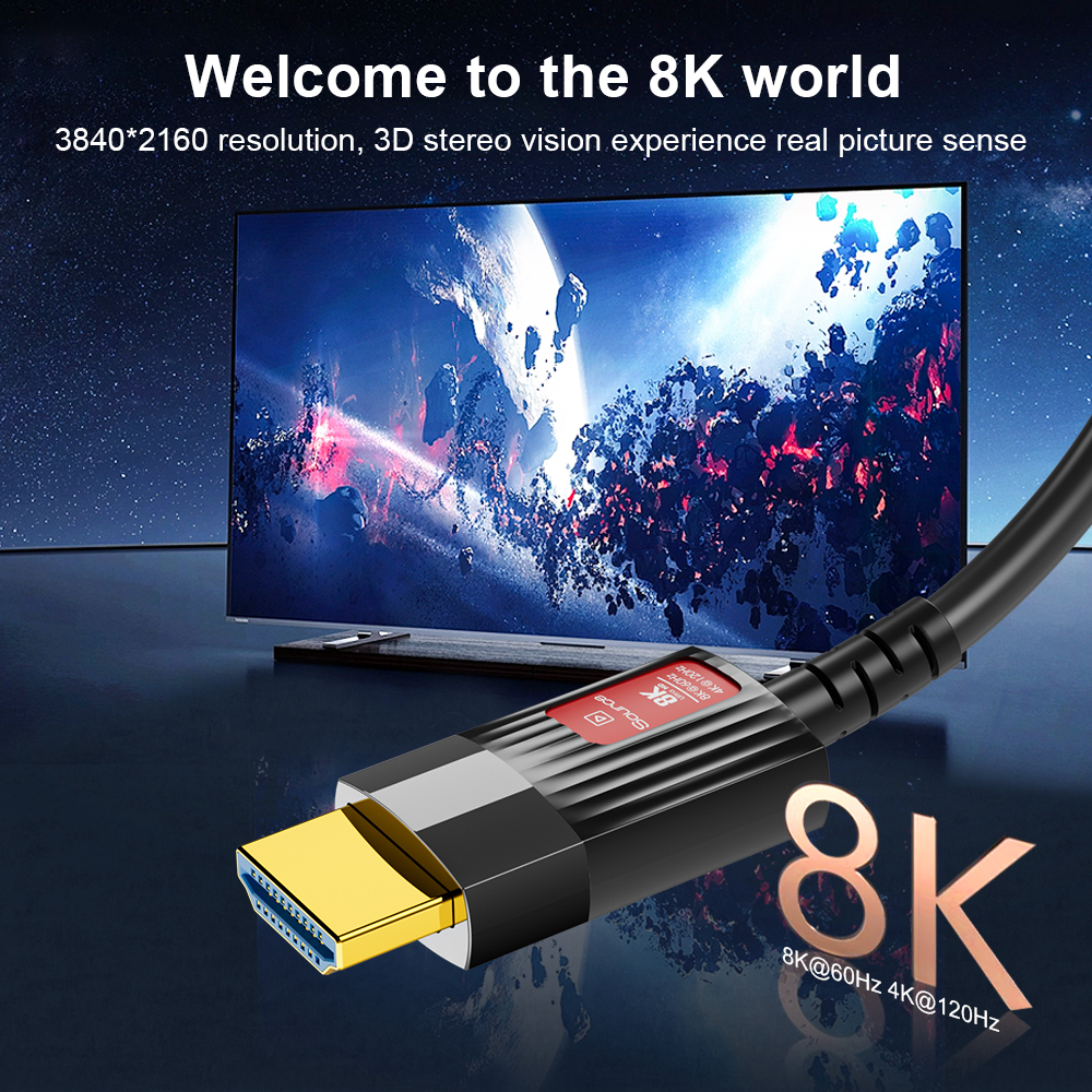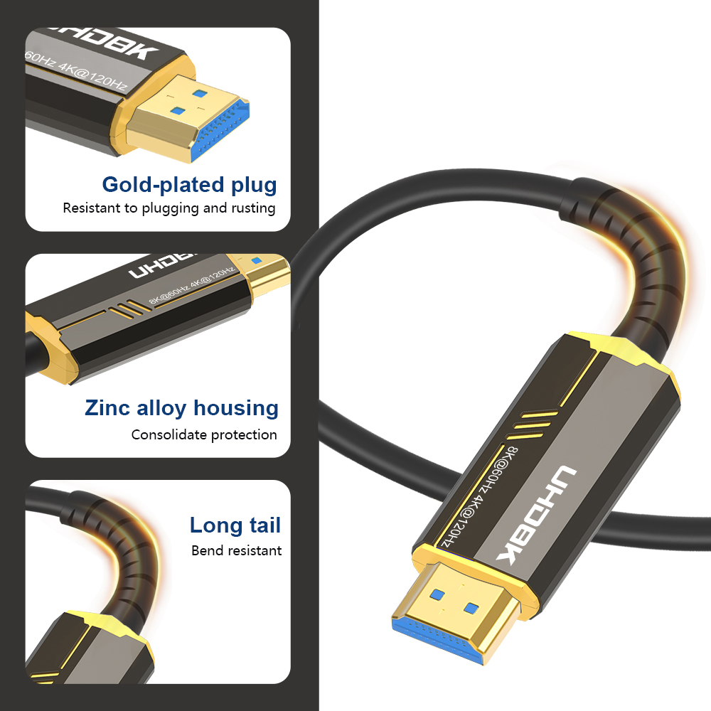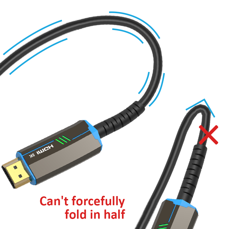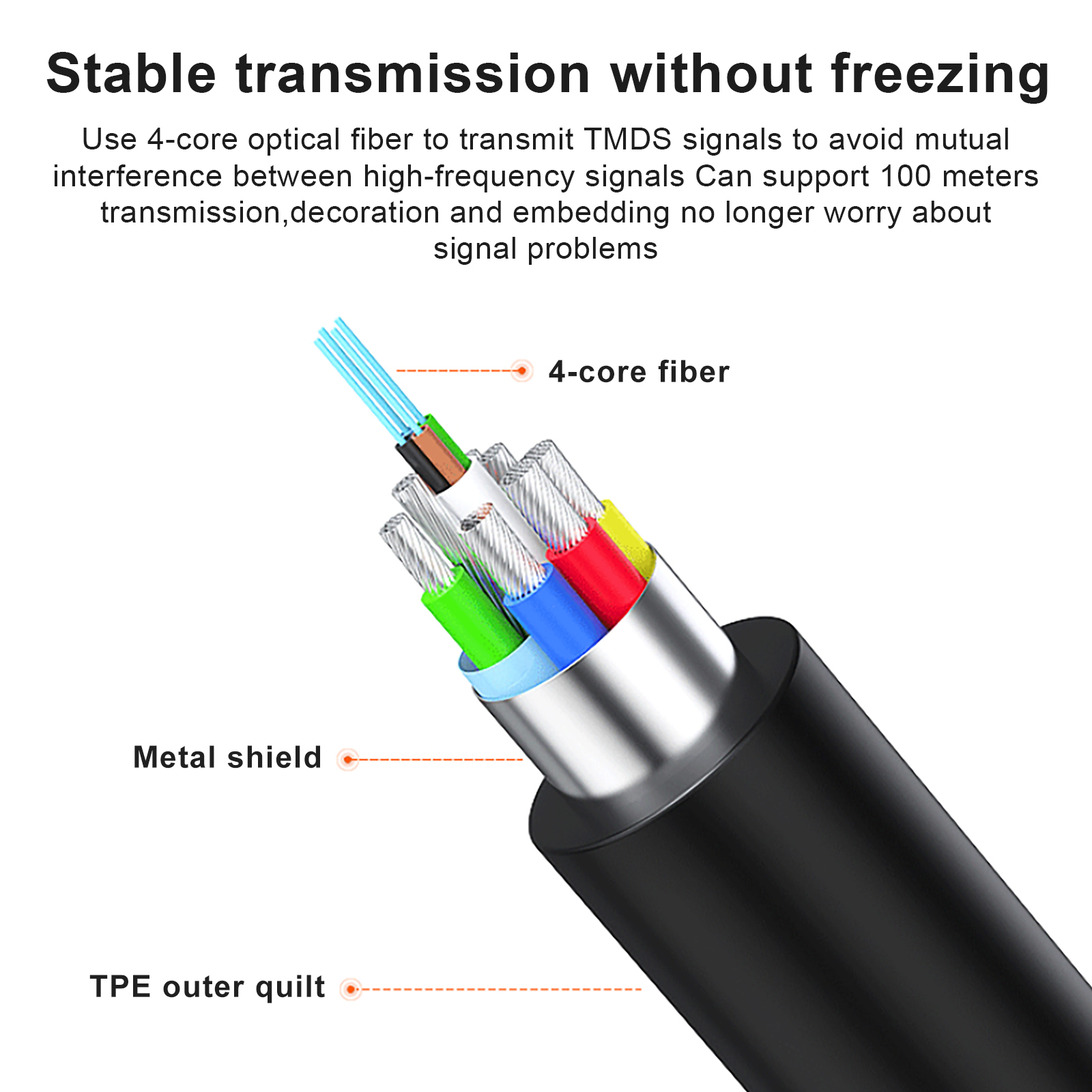3. Скорость передачи этого оптоволоконного кабеля HDMI 2,1 выше, чем у обычного медного кабеля HDMI, традиционный медный кабель HDMI не может передавать 4K при 60 Гц на большие расстояния.