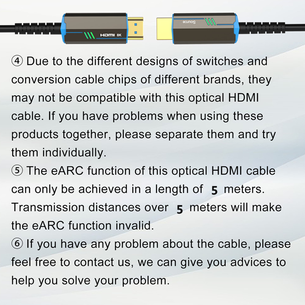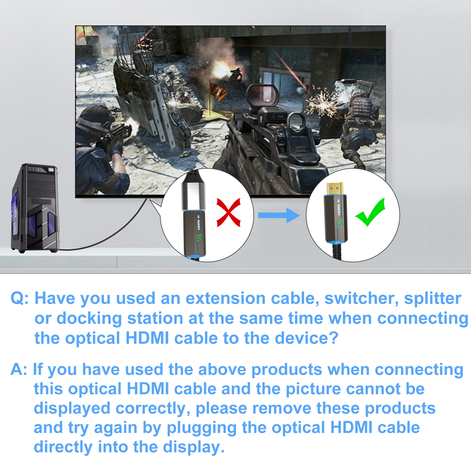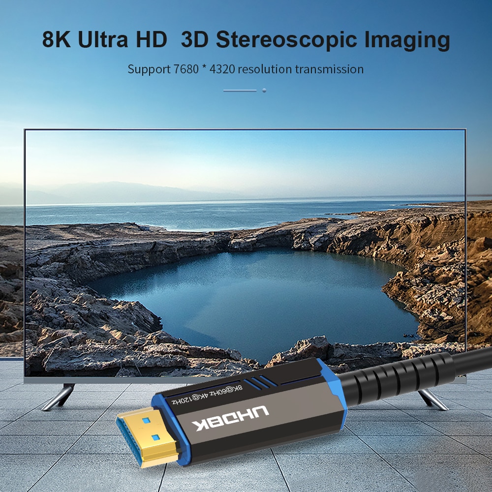 3. Скорость передачи этого оптоволоконного кабеля HDMI 2,1 выше, чем у обычного медного кабеля HDMI, традиционный медный кабель HDMI не может передавать 4K при 60 Гц на большие расстояния.