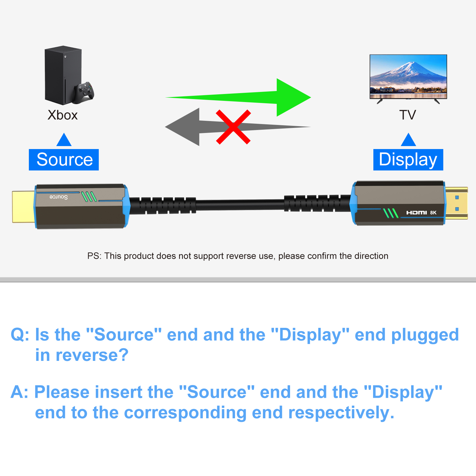 【Примечание】 Этот оптоволоконный кабель HDMI является только односторонней передачей, а не двунаправленной. Обратите внимание на «Источник» и «Дисплей».