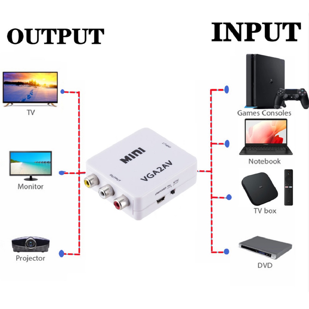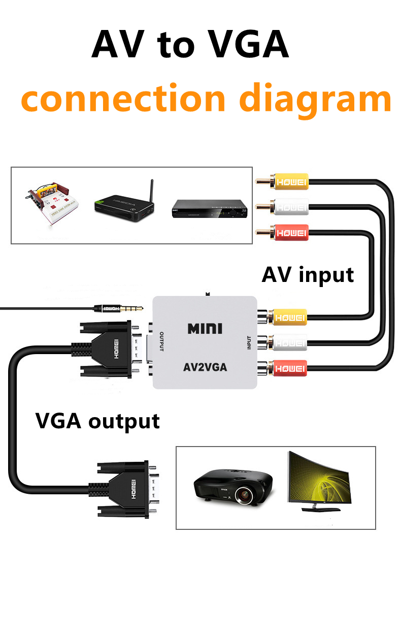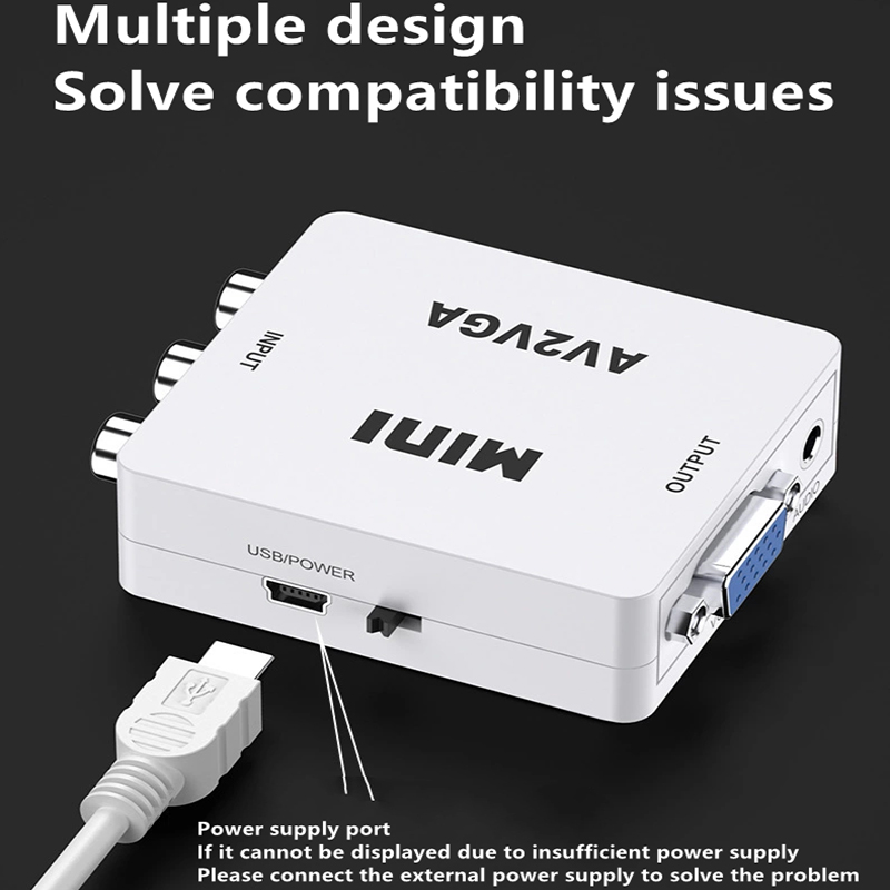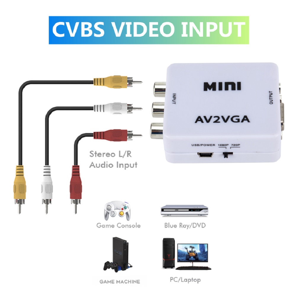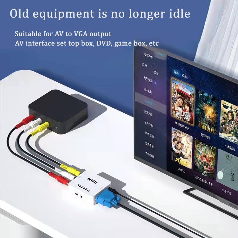 1. Plug and play, no need to drive software. The video converter is connected to the display device with VGA interface for the old device AV red yellow and white interface set-top box DVD recorder monitoring.