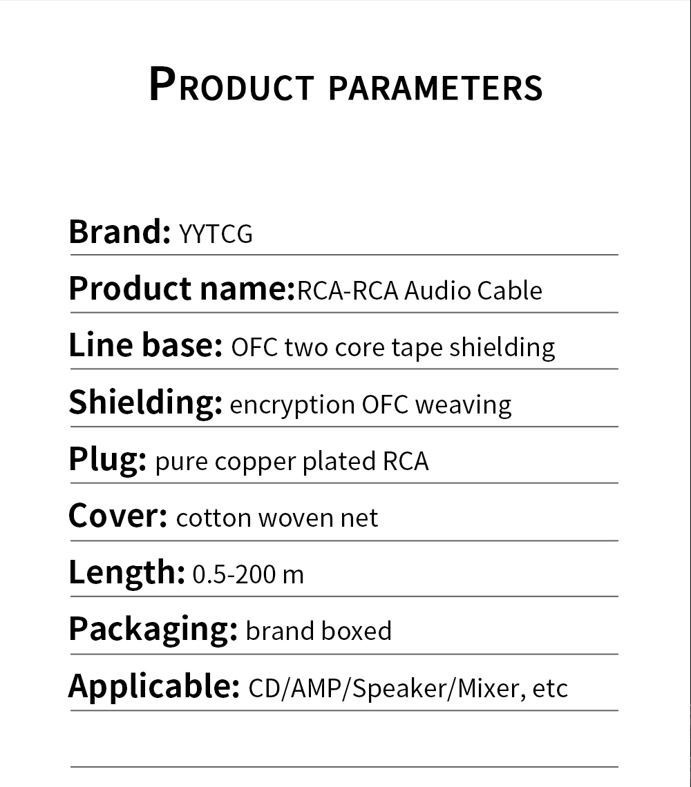 Применимо: CD/AMP/динамик/микшер и т. Д. Конструкция с высоким шумоподавлением Конструкция кольца из углеродного волокна, качество звука без искажения Кабель OFC высокой чистоты, делает фон музыки более тихим, чистым звуком, толщиной средней частоты, низкочастотная гибкость, широкое звуковое поле, сильная сила, качество звука HIFl. Покрытие из чистой меди RCA L повысить качество звука, толстая позолота сенсорной пластины, Длительный срок службы Декодер подключает динамиков Сигнал передается в звуковую коробку без потерь, а хороший звук восстанавливается и разрешается в высокой степени