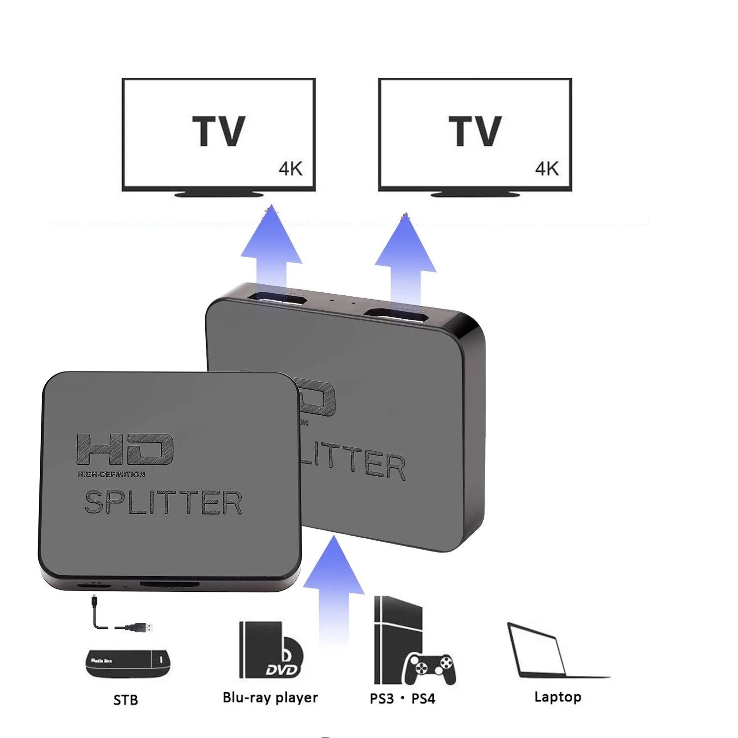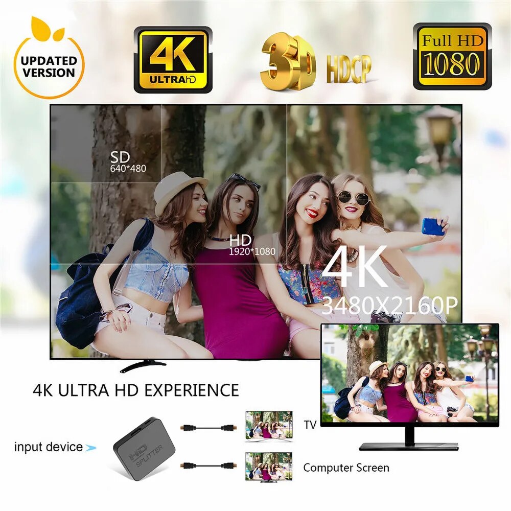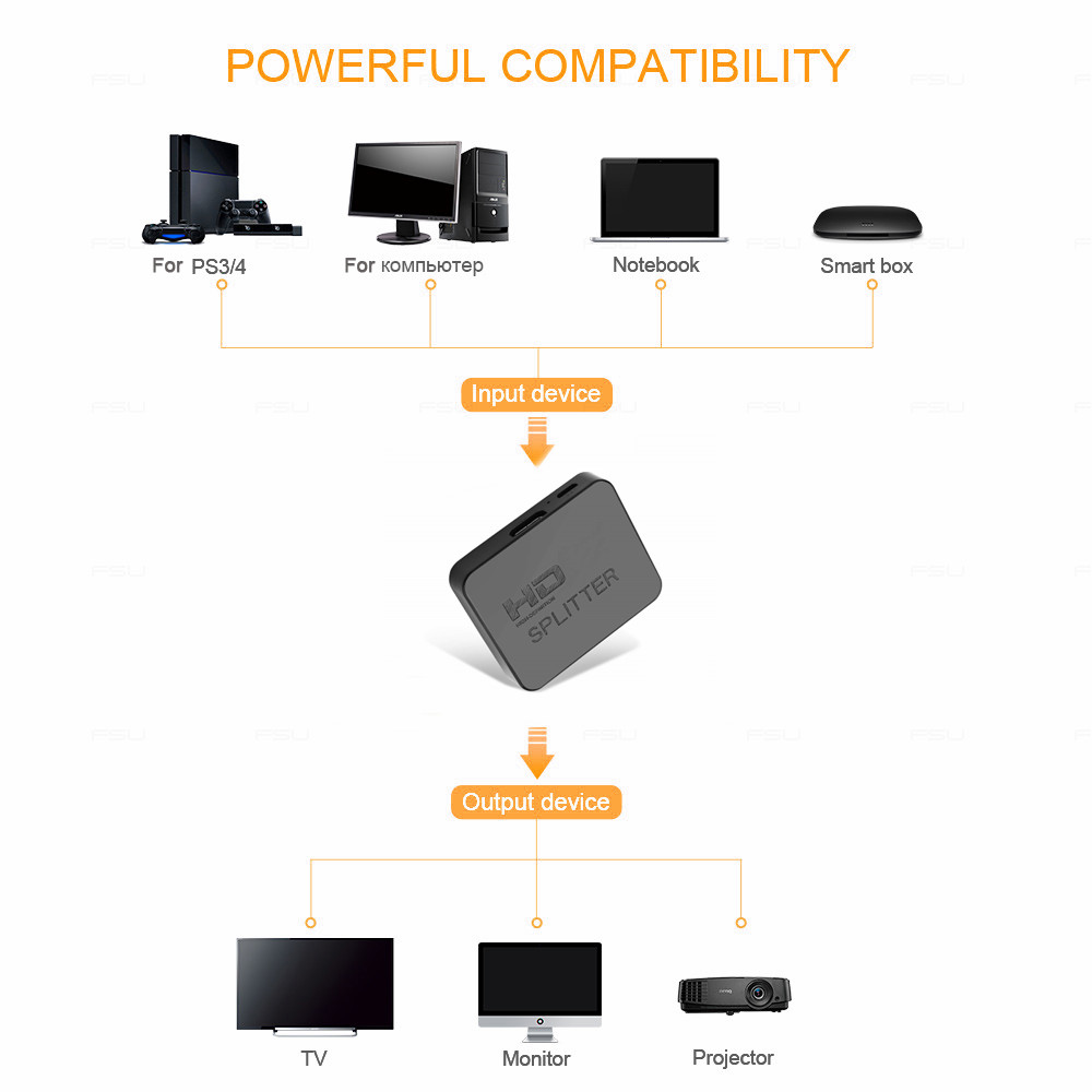 The HDMI-compatible Splitter 1x2 offers HD video solution for supermarkets, shopping malls, HDTVs, STB, DVDs, projector factories, data control centers, information distribution, conference rooms presentation, education and training, corporation showrooms, home theaters and more.