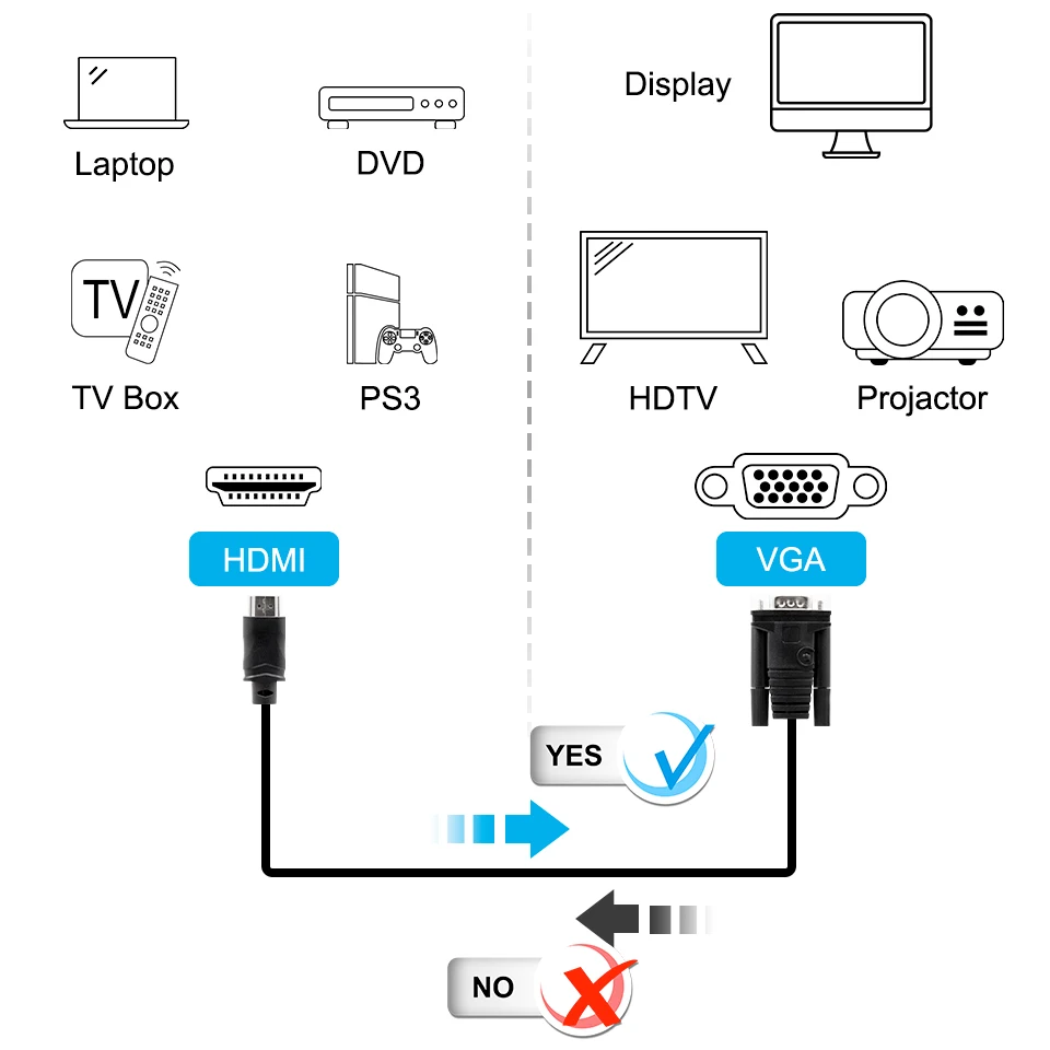 Этот кабель HDMI-VGA не является двунаправленным кабельным адаптером, вы можете подключить только один выход HDMI к одному входу VGA, и обратите внимание, что выход VGA не поддерживает передачу звука.