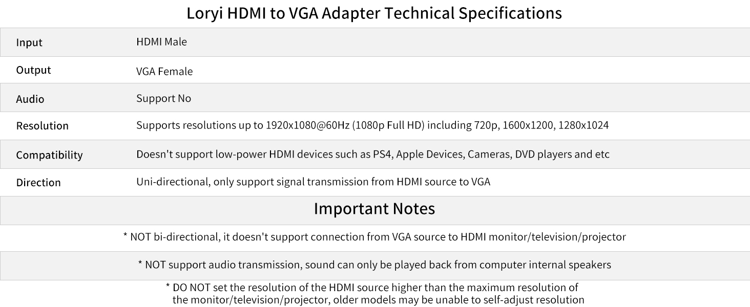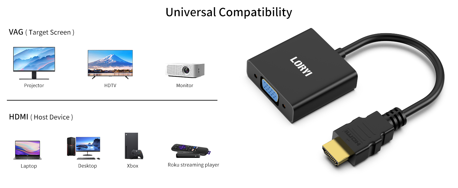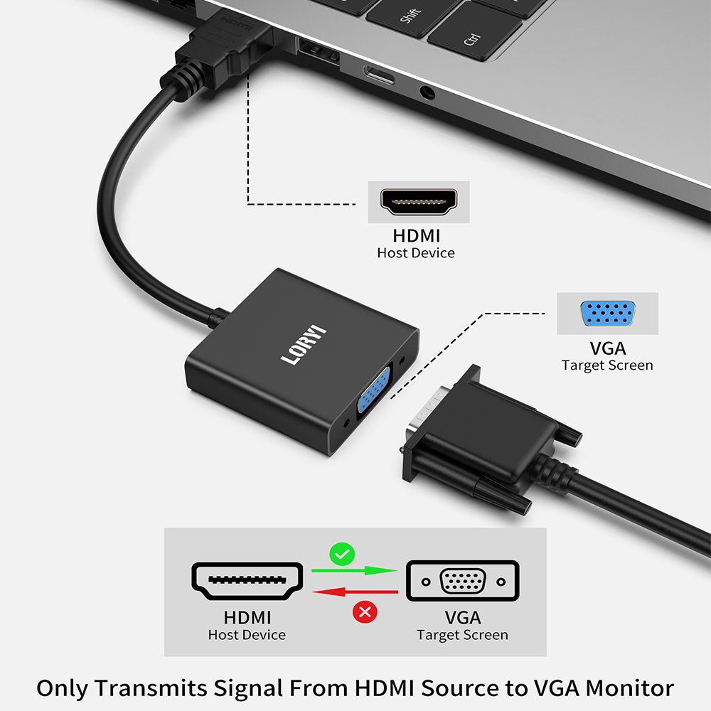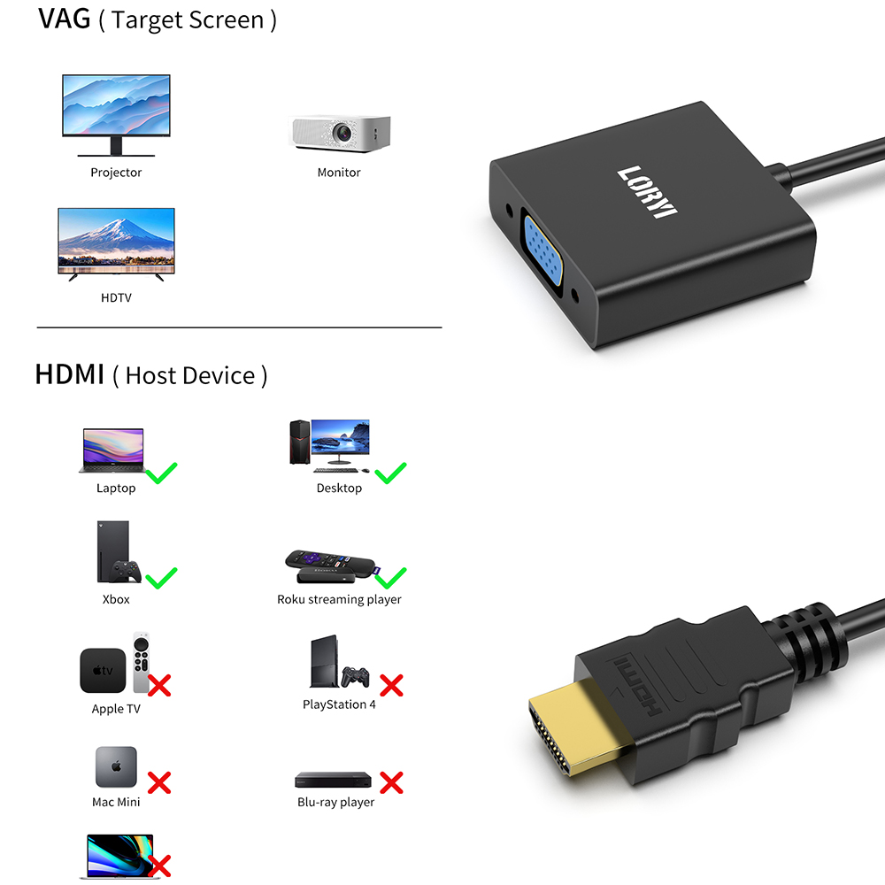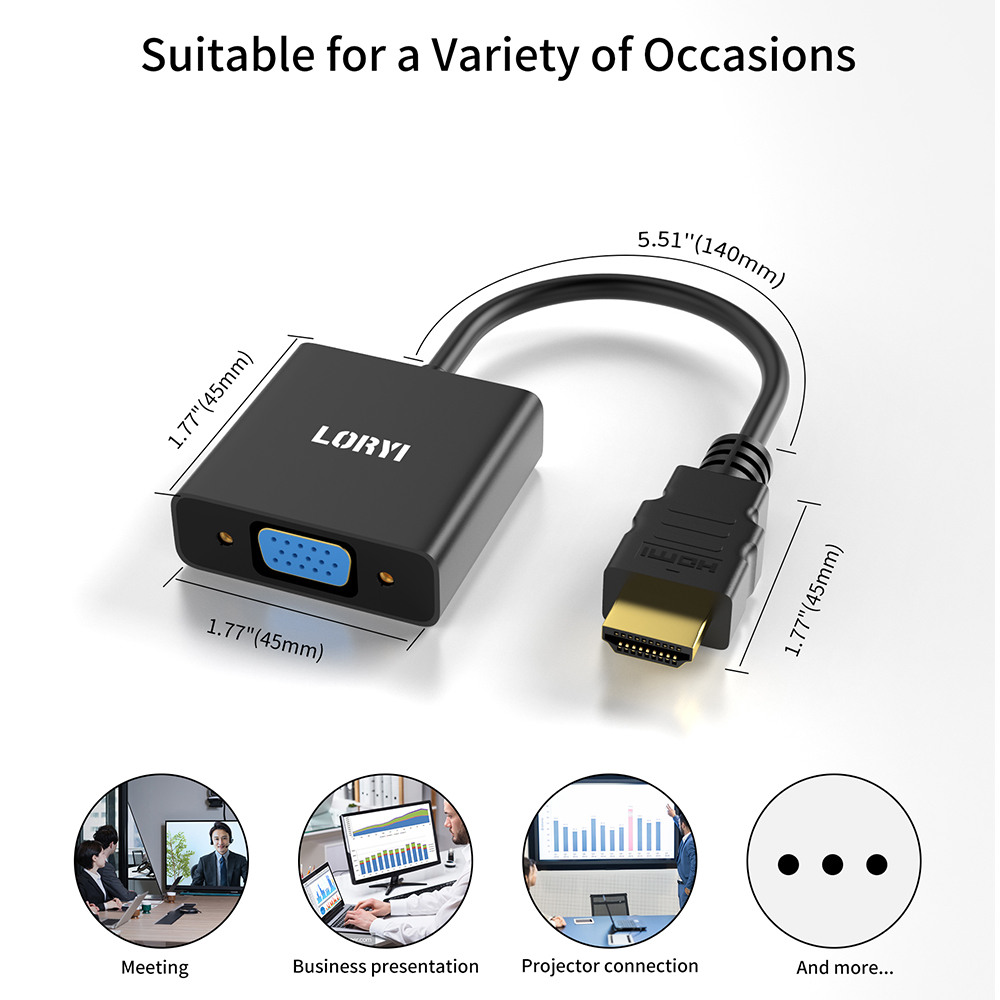 1. КОМПАКТНЫЙ ДИЗАЙН-Компактный портативный адаптер LORYI HDMI-VGA подключает компьютер, настольный компьютер, ноутбук или другие устройства с портом HDMI к монитору, проектору, HDTV, или другие устройства с портом VGA; Уложите этот легкий гаджет в сумку или карман, чтобы провести деловую презентацию с помощью ноутбука и проектора, Или Расширьте экран рабочего стола до монитора или телевизора; Требуется кабель VGA (продается отдельно)
