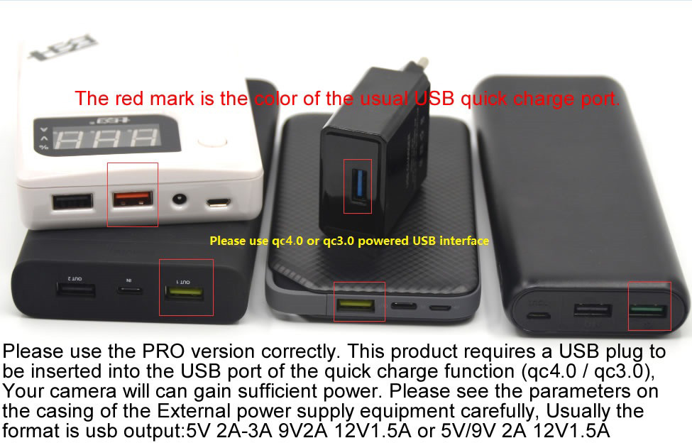 (3) Поддерживается большинство портов питания USB с функциями QC4.0 или QC3.0, поэтому выбор внешнего источника питания для камеры более широк.