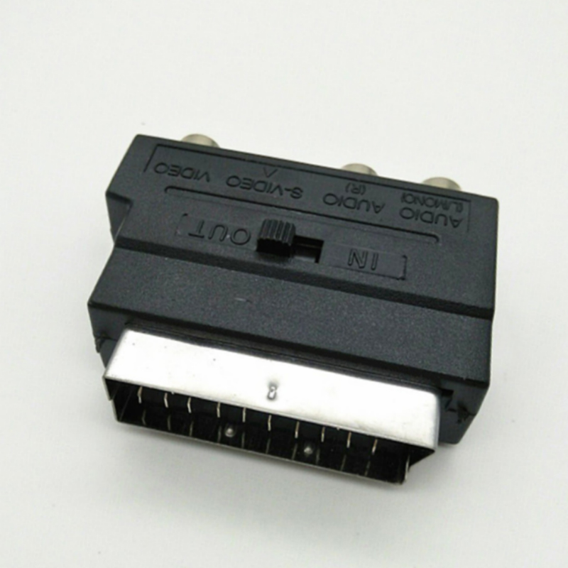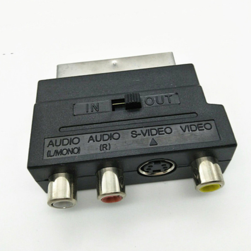 Этот адаптер SCART оснащен тремя цветными кодами phono(RCA), S-Video socket и выберите переключатель, что позволяет адаптеру использоваться для ввода или вывода аудио/видео сигналов.