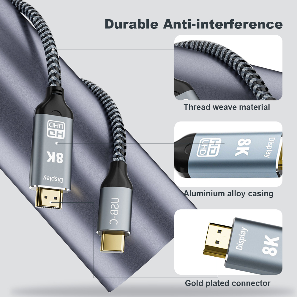 【Сверхпрочный кабеле】 Алюминиевый корпус, крышка из нейлоновой оплетки и Позолоченные разъемы обеспечивают превосходную долговечность кабеля 8K USB Type-C-HDMI 2,1 в условиях интенсивного использования и многократного подключения и отключения.