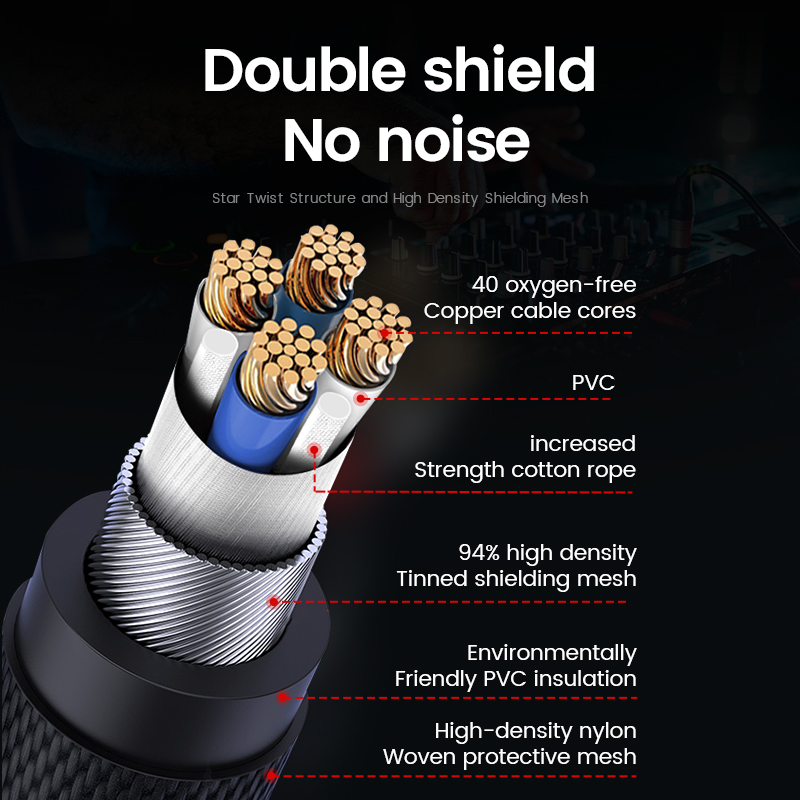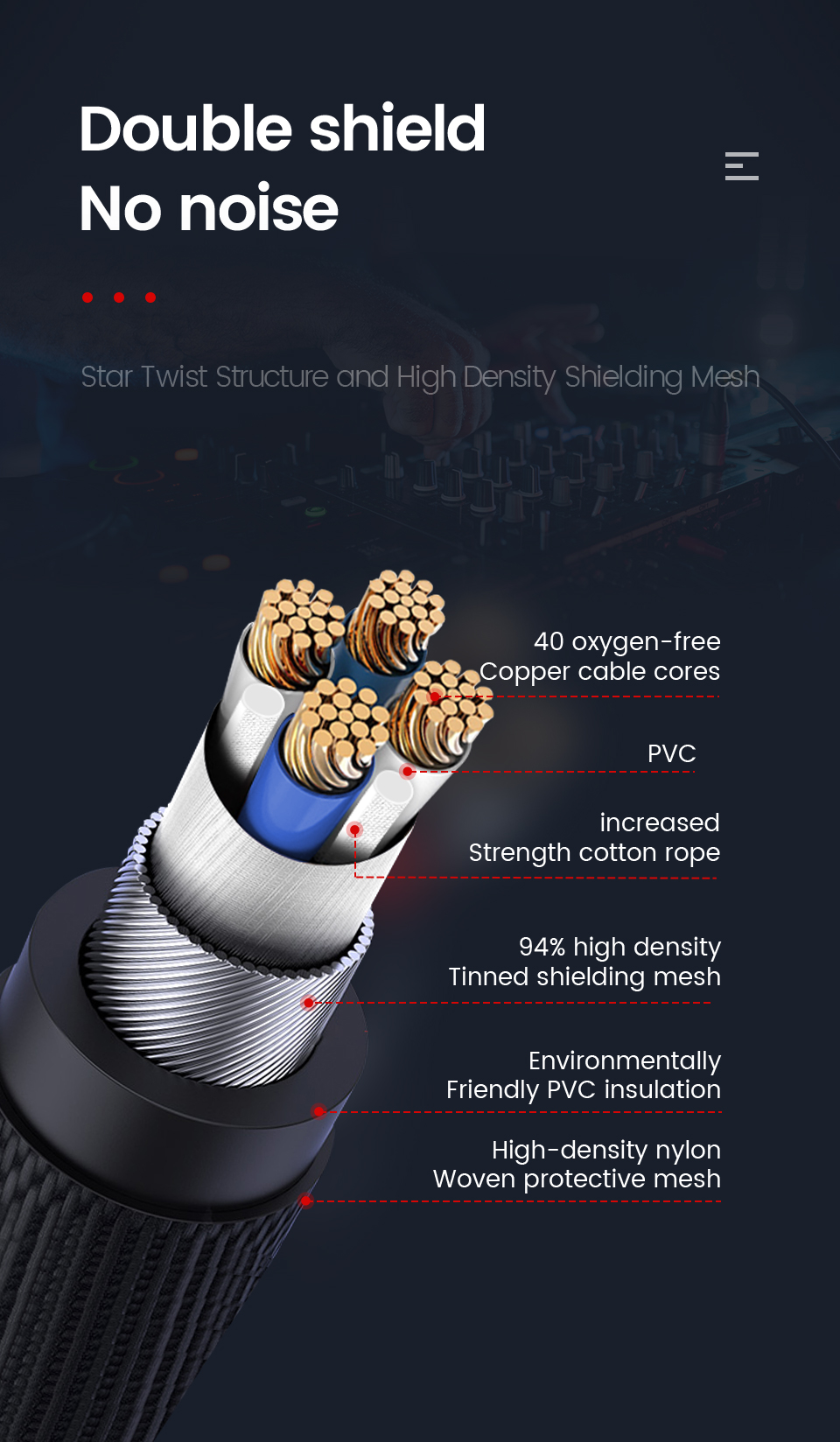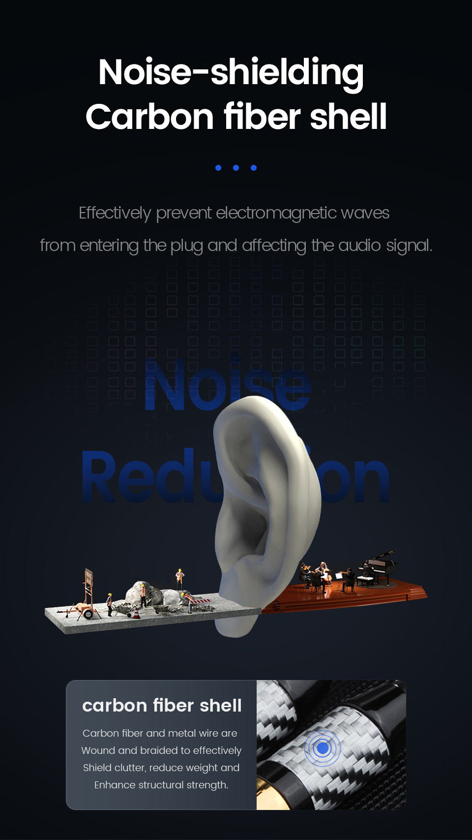 The double shielding structure of the star-twisted structure and the high-density tinned shielding net makes the noise disappear. The plug shell of carbon fiber prevents clutter from entering from the plug.