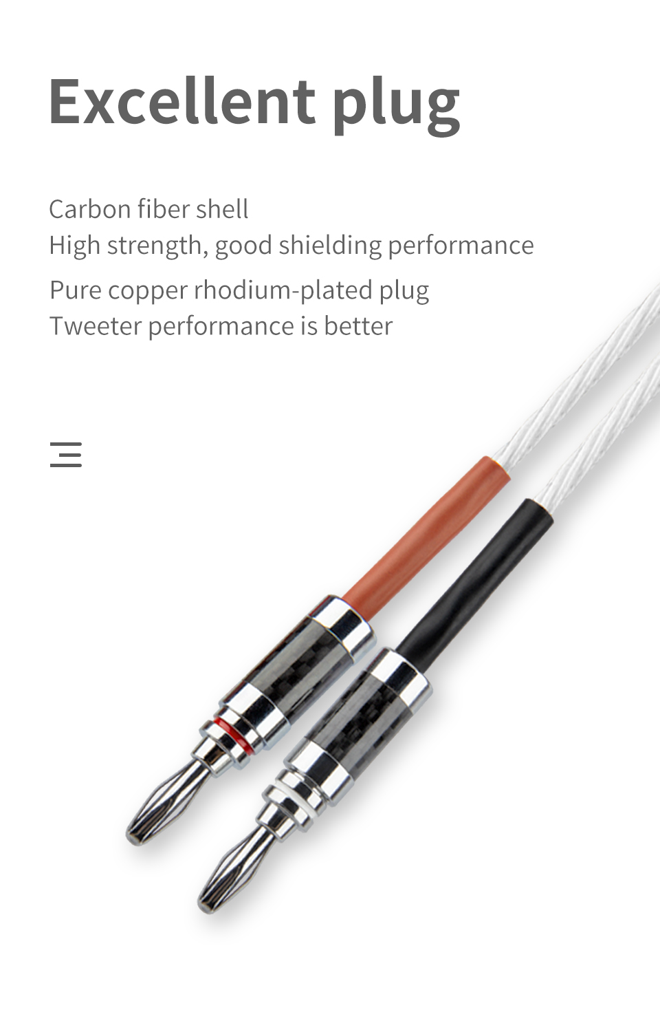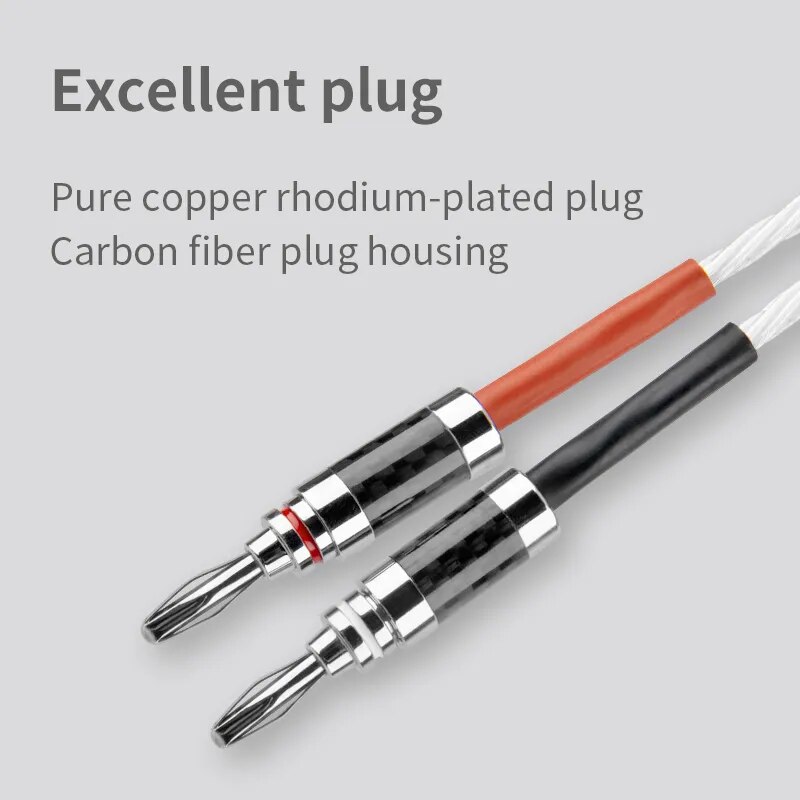 Заглушка изготовлена из чистой меди, а внешний слой покрыт родием. Обладают высокой износостойкостью и коррозионной стойкостью. Убедитесь, что вилка плотно подключена к устройству в течение длительного времени. Корпус изготовлен из сплава углеродного волокна, который обладает высокой прочностью и может эффективно изолировать внешние сигналы от входа из вилки, делая звук реальным.