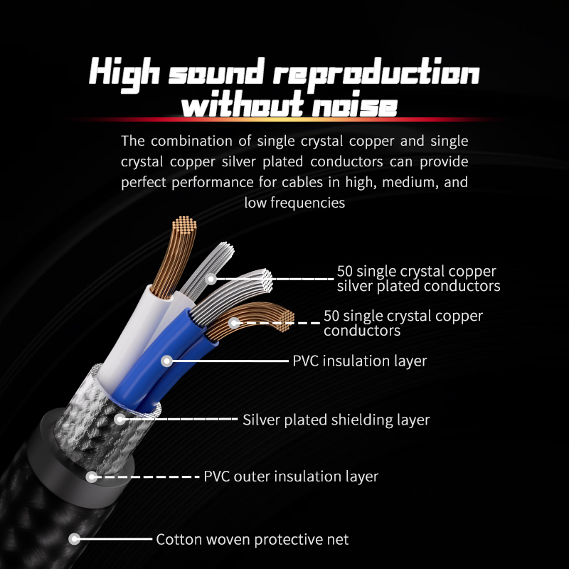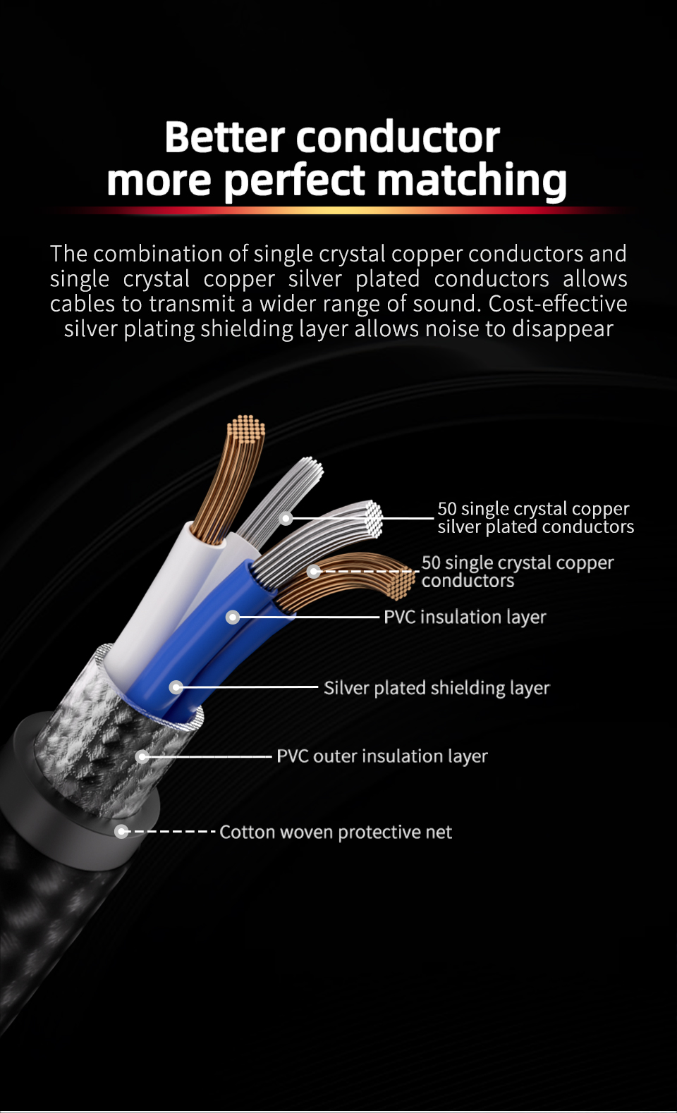 1. Кабель изготовлен из посеребренной монокристаллической меди (OCC) 7N и обладает отличной проводимостью. Он может пропускать слабые сигналы через кабель и заставлять ваш динамик излучать более насыщенные музыкальные детали.