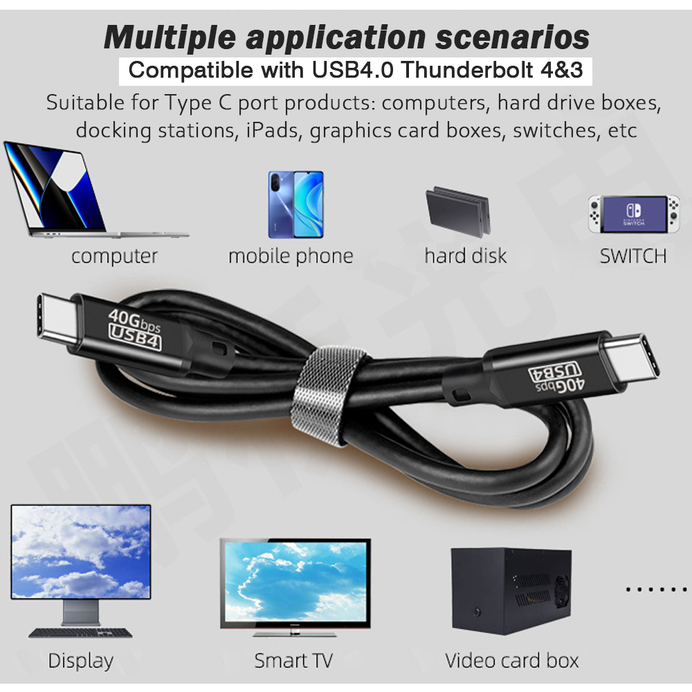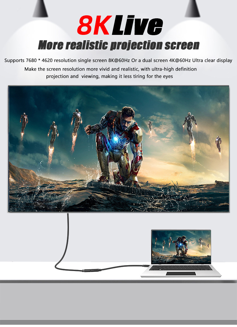Скорость передачи:40 Гбит/с, поддержка одного экрана 8K при 60 Гц или двойного экрана 4K при 60 Гц Сверхчеткий дисплей; Поддерживает разрешение 7680*4620.