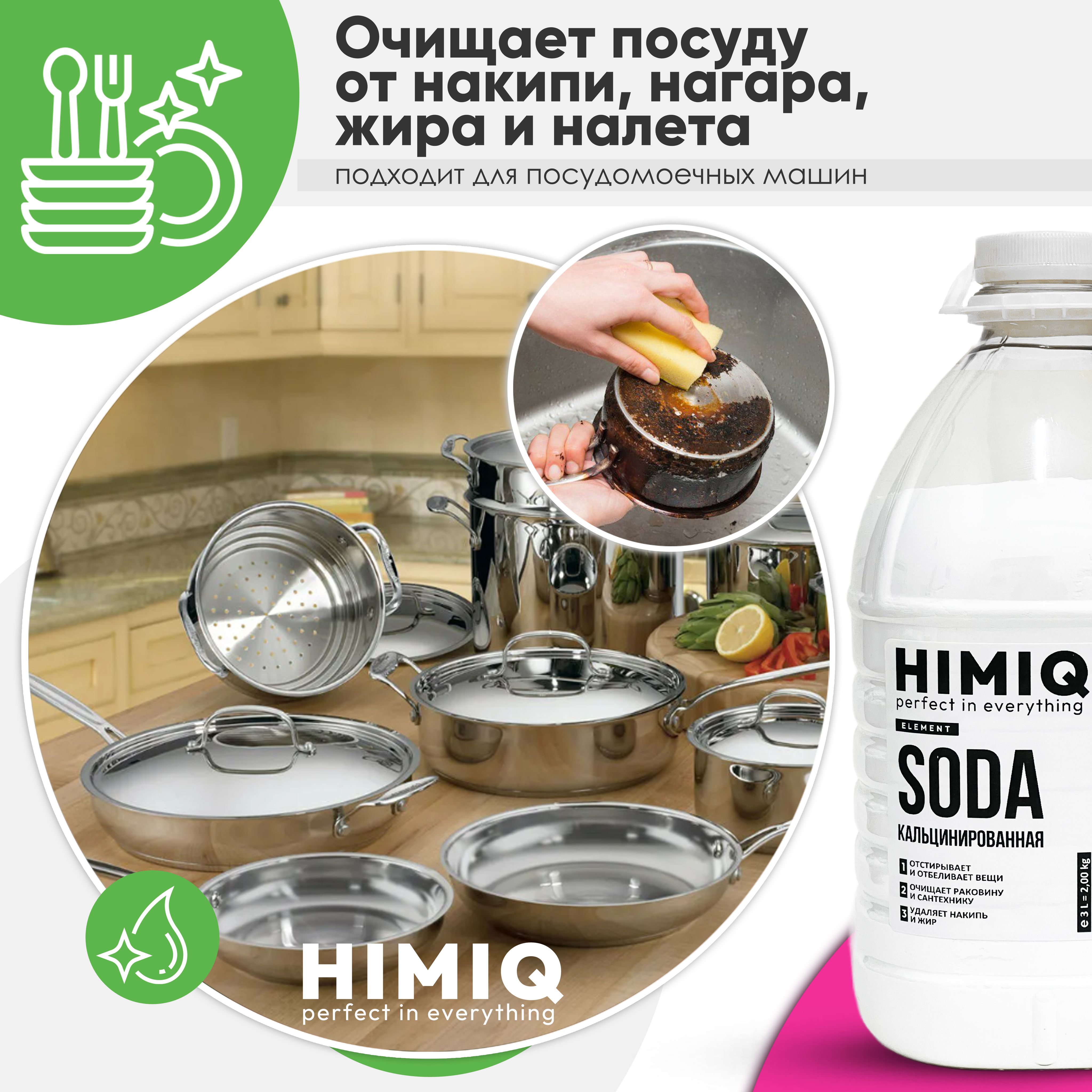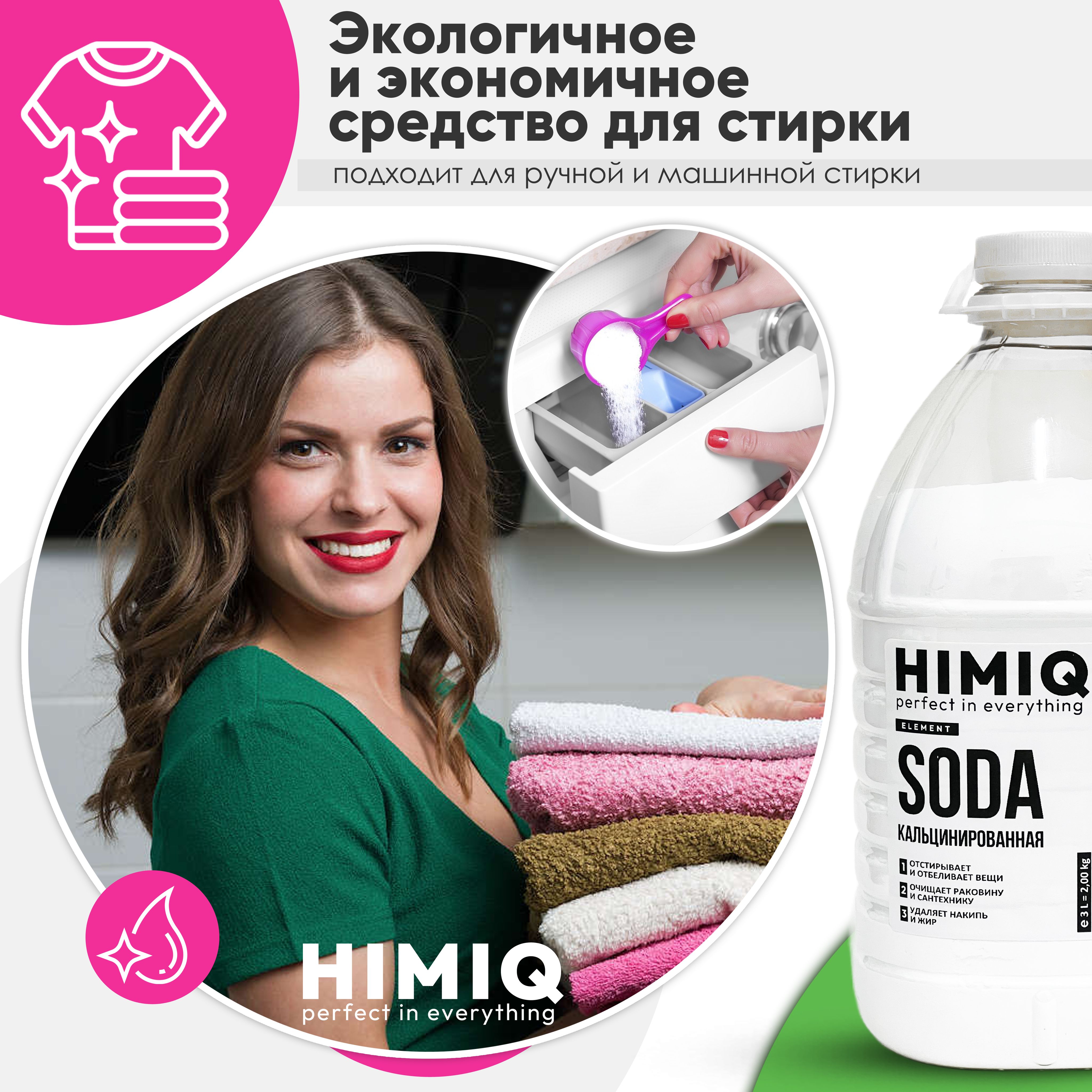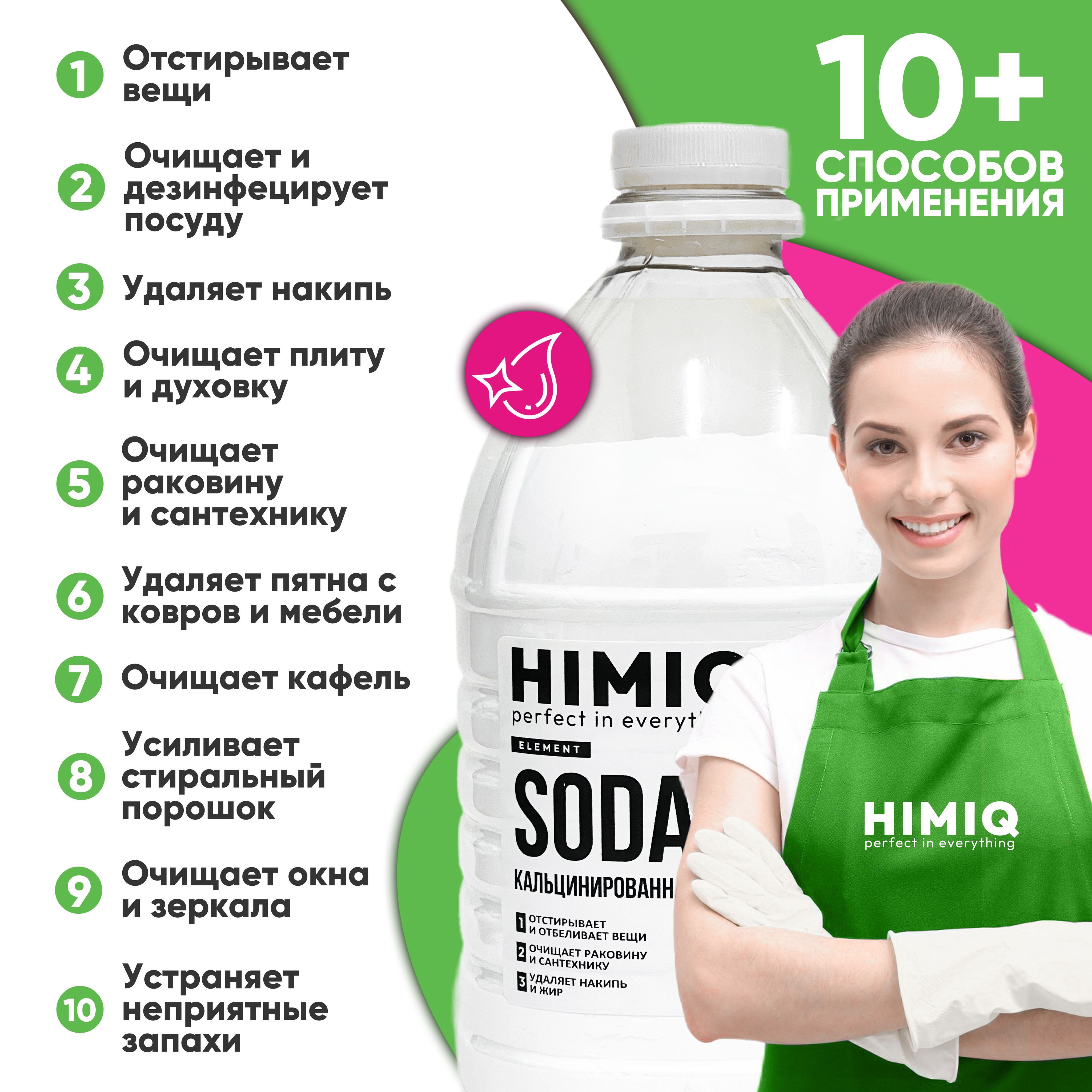 Описание: Кальцинированная сода HIMIQ - это отличное дезинфицирующее, моющее чистящее средство. Самое эффективное народное средство для смягчения воды, для чистки стиральных машин, для профилактики от накипи. Эффективна как антижир, применяется для стирки и кипячения тканей, мытья фарфоровой, фаянсовой и эмалированной посуды, а также для других хозяйственных целей. С помощью кальцинированной соды освежают и отбеливают пожелтевшие вещи из хлопковой и льняной ткани: майка, футболка, скатерть, столовое и постельное белье. Можно замочить вещи в содовом растворе (3 ст. ложки на ведро теплой воды). Или стирать без замачивания, добавив такое же количество соды прямо к белью. Она усилит стиральный порошок или гель для стирки, поможет удалить пятна и сильные загрязнения. Кальцинированную соду HIMIQ используют также вместе с порошком не только для стиральных машин автомат, а также для ручной стирки. Для сантехники надо смешать кальцинированную и обычную соду в соотношении 1:1, развести немного водой для получения кашицы. Полученное средство нанести на внутренние поверхности ванной, раковины, унитаза. Через 15 минут, не удаляя соды, обработать загрязненные места смесью уксуса и бельевого отбеливателя белизна. Подождать полчаса, после чего все смыть струей воды. Для кафеля достаточно развести 3 ст. ложки соды в литре воды. Полученным средством можно не только удалить загрязнения с кафельной плитки, но и хорошо вымыть эмалированную, керамическую и фарфоровую посуду, грязную раковину. Для устранения засоров понадобится 1 стакан кипятка, в котором надо растворить 2 ст. ложки соды. Раствор аккуратно выливается в сливное отверстие засоренной трубы. Через четверть часа слив хорошо промывается горячей водой. От накипи прокипятить в эмалированном чайнике воду с небольшим количеством соды, с его внутренних стенок легко удалится накипь От известкового налета в стиральных машинах нужно развести соду таким же количеством воды, нанести эту смесь на резиновые уплотнители и внутреннюю поверхность барабана. Подождать 30 минут. После этого удалить средство с помощью губки, а затем еще раз промыть машину, запустив цикл стирки без закладки белья.