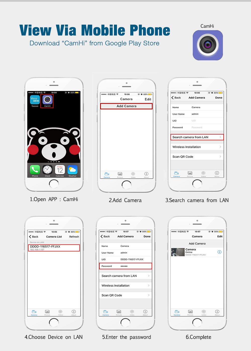 Удаленно просматривайте камеру с помощью: бесплатного приложения «CAMHI» на вашем мобильном устройстве, бесплатно
