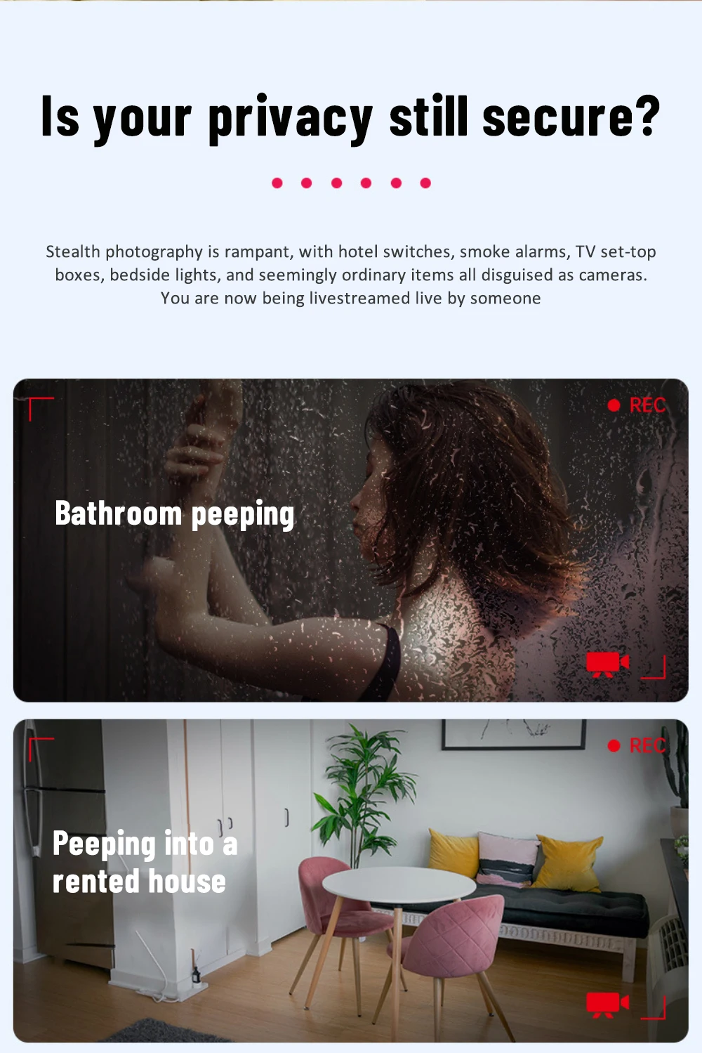 3. Душевая лейка, крючок, рядная вилка, выход воздуха из кондиционера, телевизора, подушки и т. Д. Можно тщательно обнаружить. Детектор камеры отказывается подглядывать, чтобы люди могли чувствовать себя непринужденно.