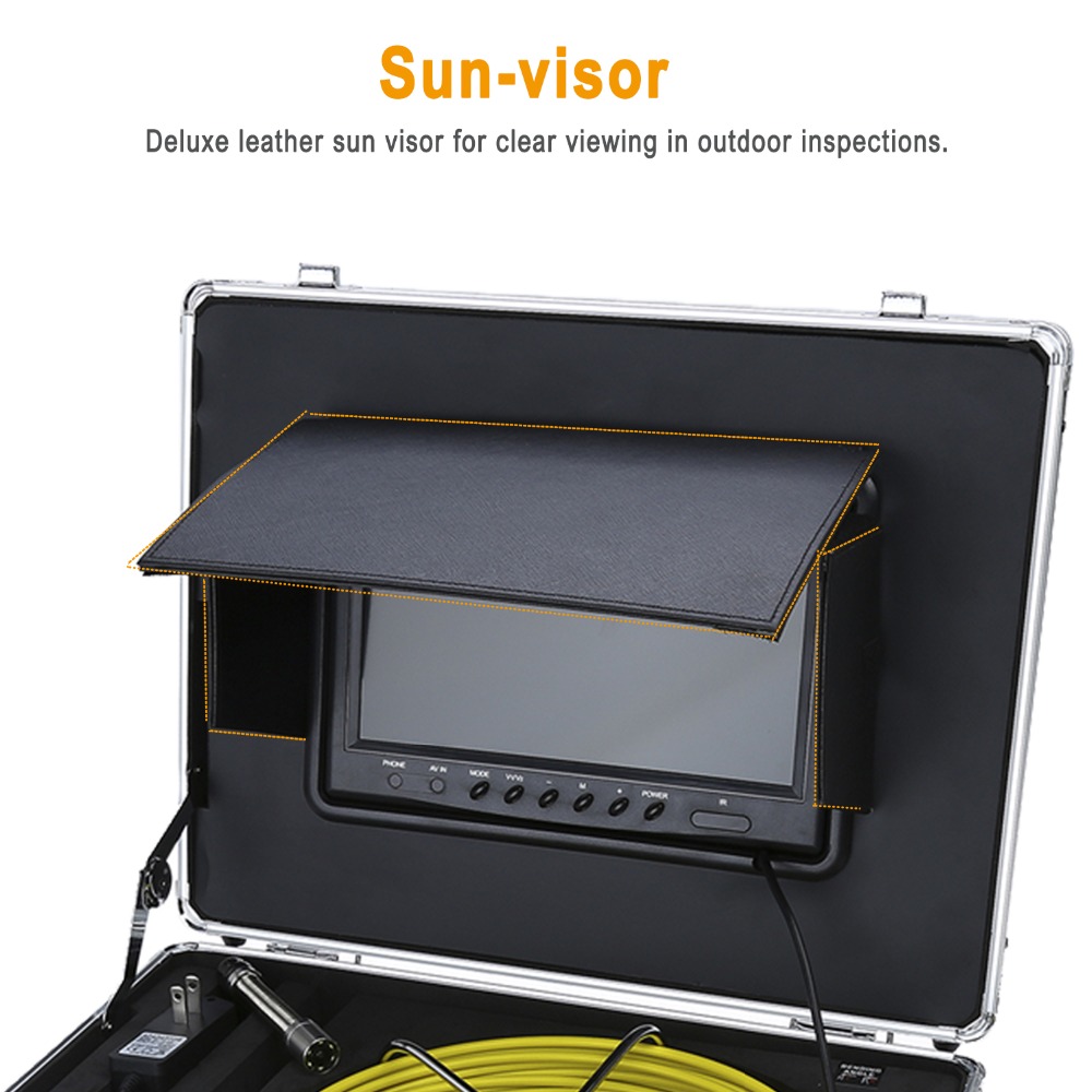 Монитор и кабель】: Профессиональная камера для инспекции канализационных труб/канализационных трубопроводов разработана с 9-дюймовым цветным TFT ЖК-монитором с солнцезащитным козырьком для наружных проверок. Материал проволоки-стержень из стекловолокна (диаметр: 4,8 мм), антикоррозийный/холодный/растяжимый.