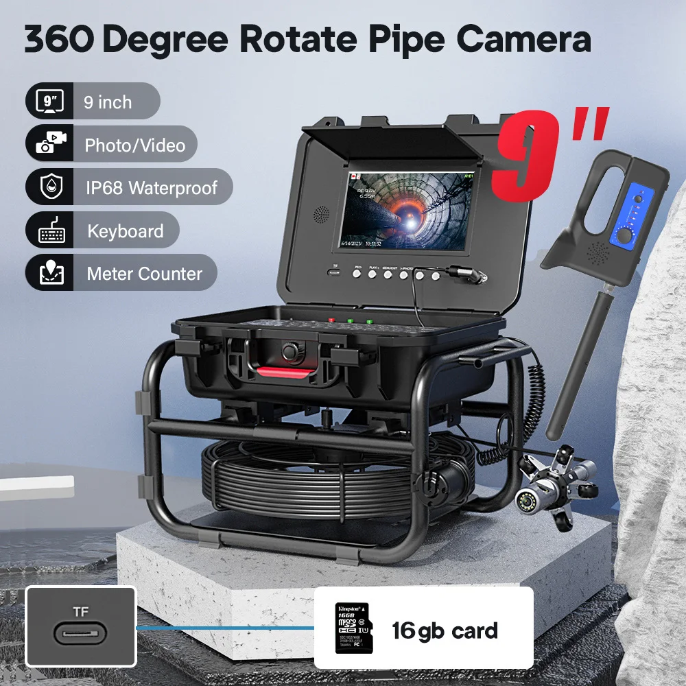 Камера для осмотра труб с 9 "1080P IPS DVR монитором, Поворот на 360 градусов с двумя объективами 7 мм Волоконная трубка канализационная камера с локатором 512 Гц