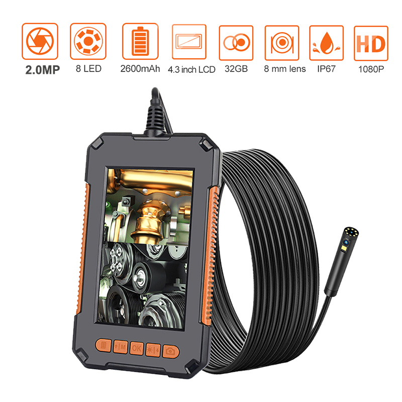 Камера для труднодоступных мест с фонариком 1080P, экран 4,3 дюйма, IP68, 8 светодиодов
