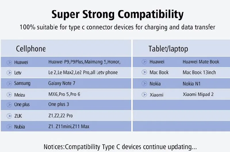 Type-C Charger Cable Compatibility List (Partial List):