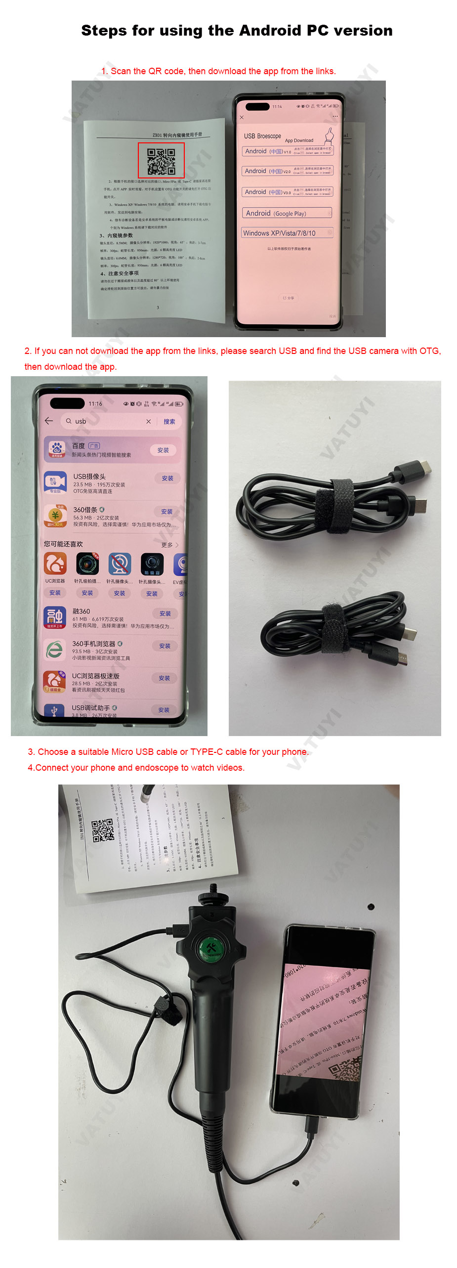 Версия для ПК Android подключена, вы можете использовать наш кабель Micro USB или кабель TYPE-C для подключения эндоскопа и телефона Android для просмотра видео. Совместим с телефонами Android и ПК.