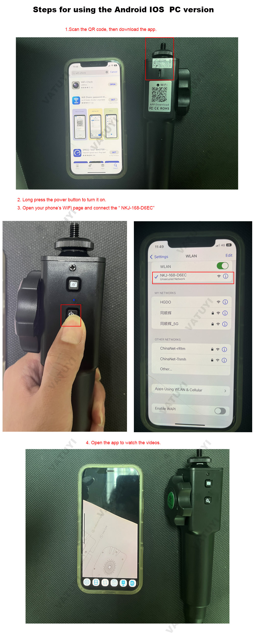 Просто загрузите приложение для магазина приложений (iPhone), магазина Google Play (Android) или своего компьютера и Подключите камеру прицела к телефону через USB-кабель. Следующий Включите управляемую инспекционную камеру, и вы можете сразу начать снимать изображения и видео высокого качества.