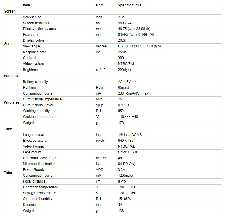 Особенности: 1. Функция видеовыхода для просмотра на большом экране. 2. Функция переворота изображения для просмотра под разными углами. 3. Легкая компактная конструкция для легкого поиска, диагностики и решения проблемы. 4. Регулируемая яркость справа от светодиода. 5. 2,4 "TFT-LCD цветной монитор, регулируемая яркость. 6. Водонепроницаемая мини-камера 8 мм с гибкой удлиненной трубкой. 7. Изготовлено и протестировано в соответствии со стандартом водонепроницаемости ip67. 8. 4 батарейки АА для источника питания.